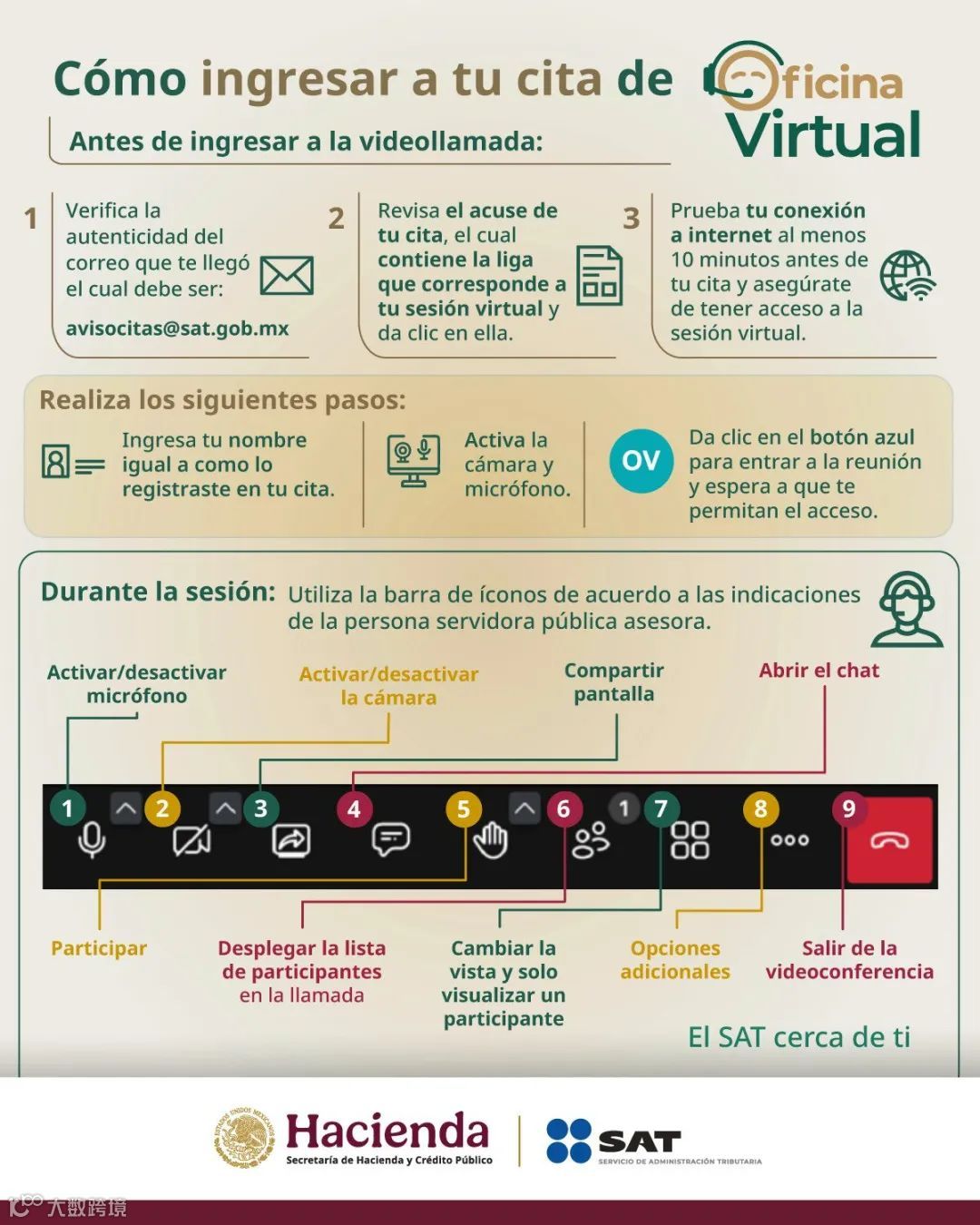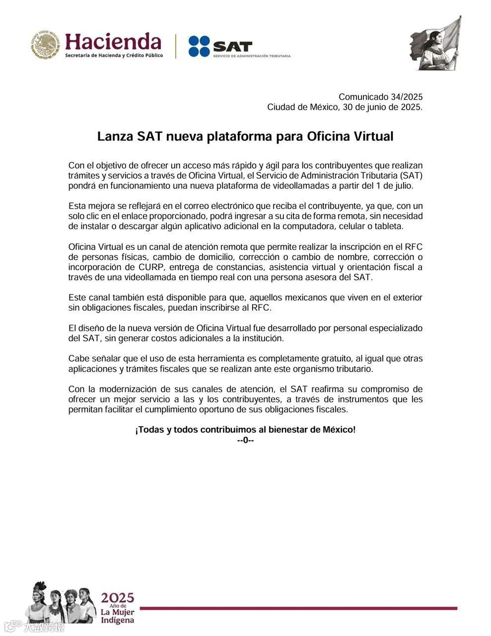 7月1日,墨西哥税务管理局(SAT)正式推出虚拟办公室平台(Oficina Virtual),支持纳税人通过远程视频申请 RFC 税号(纳税人登记代码),实现从 “线下递交 + 现场审核” 到全流程远程数字化操作的变革。