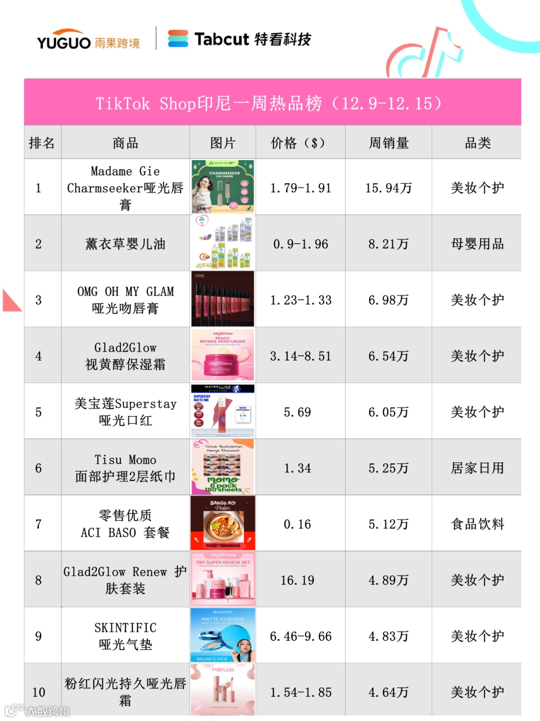从本期印尼热销品榜单来看,美妆个护一跃成为主流消费品类,众多护肤产品销量骤增,其中最热门的莫过于各类唇膏产品,占据榜单过半席位。而母婴用品、食品饮料、居家日用品类仅分别有一款商品上榜。