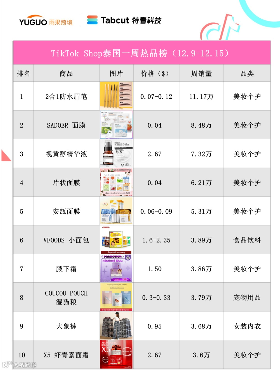 在泰国本期 TOP10 榜单中,“美妆个护”品类上榜的商品多达 7 个席位,主要涉及眉笔、假睫毛、面膜产品;女装内衣、宠物用品、食品饮料品类则分别有一款商品上榜。
