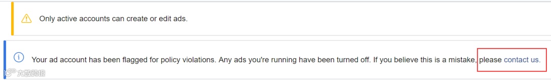 如果认为广告账户被禁用属于误判,请直接在ads manager中点击“contact us”,向Facebook提交申诉;广告被拒登同理。