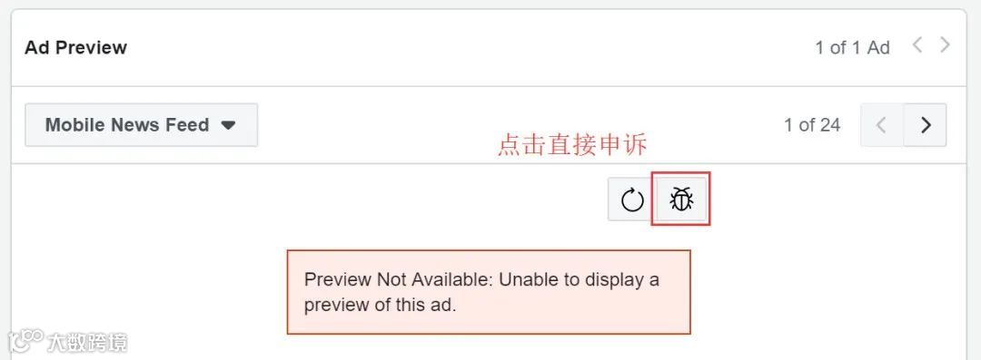 这时广告无法编辑和预览是系统问题,可以在页面“预览”中点击小爬虫按钮,向Facebook提交该问题。