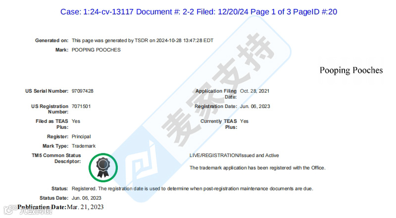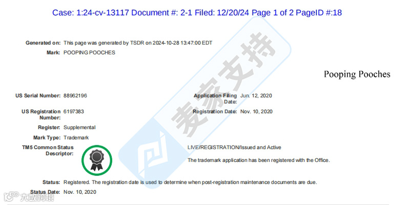 不少卖家还深陷David律所代理David Peterson的拉屎的狗版权TRO中,这边Rosenbaum律所代理Gag Gifts For Good Causes, LLC的Pooping Pooches商标维权又来袭!均与拉屎的狗日历相关,本次涉案商标号为:6197383和7071501,分别注册在服饰和日历品类,跨境卖家速速排查!避免一波未平一波又起,雪上加霜!