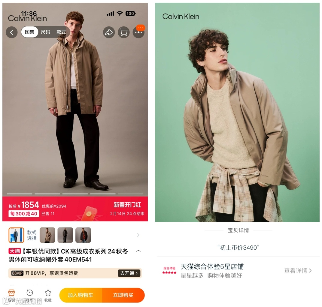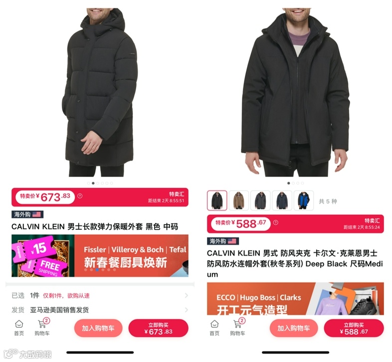 CK秋冬外套在美国亚马逊的折扣价格仅为500-600元人民币,而同款产品在中国市场的定价却高达3千多元,即便在折扣后仍接近1800元,价差近一倍。