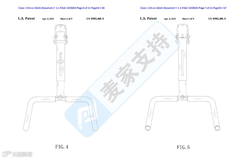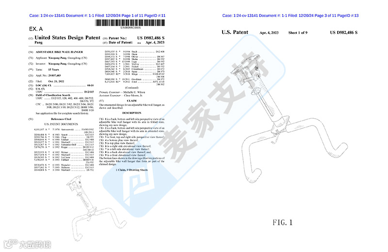本案为Dewitty 律所代理国人卖家Xiaogang Pang 针对其专利产品发起的TRO维权,涉案产品为一款可调节自行车壁挂架,美国专利号为:D982486,该专利于2022年10月21日提交申请,并于2023年4月4日专利下证。跨境卖家速速排查,未经授权上架销售则会面临TRO冻结风险。