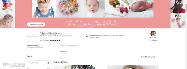 来自美国犹他州奥林,店铺装修运用了Etsy Plus的特色,整体特点明显,选择了一个利基市场——婴童头饰。产品种类繁多,包括花、蝴蝶结、发夹和面膜,以婴儿和头饰为主要产品形象(可爱,卖家违规~),迎合了该平台占压倒性比例的女性购物者。在场外推广方面,它并没有在Etsy商店的主页上标记,但搜索显示ThinkPinkBows的Pinterest页面关注者为7103,每月页面浏览量为47.5万,Instagram关注者为37.9万。场外的社交媒体运营也非常好。