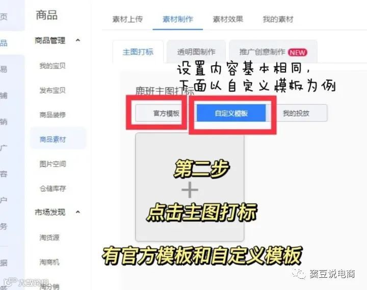 - 点击“主图打标”,系统提供官方模板与自定义模板两种选择。