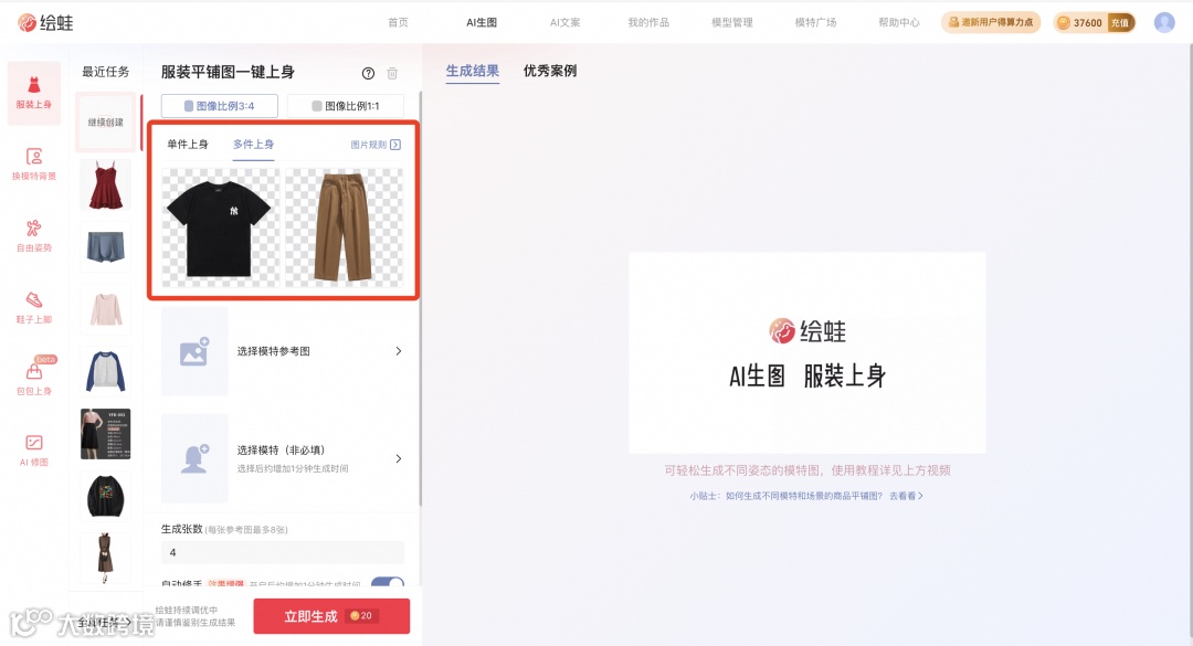 自由选择生图比例,挑选心仪的服装素材上传,进行AI服装上身,支持单件服装上传与上下装搭配上传。