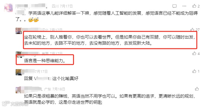 褒贬不一,有网友觉得未来AI技术早晚可以实现沟通无障碍,有的觉得多学一门语言就可以解决掉很多问题。我的观点:如果有爱好,把英语当作爱好。你如果自己不学,尽量让你的孩子学。语言不只是简单沟通的工具,它也可以是一种可以让你看到另外一个世界的工具,比如当你只会中文的时候你的全世界就局限于中文的世界,你会另外一种语言就打开了另一个世界的大门,而由于种种历史原因,英语是目前全球比较通用的语言,也就是说当你学好了英语基本可以看到全球这个世界。