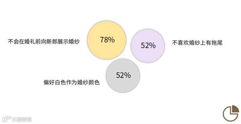 以德国关于女性对婚纱风格偏好的调査为例,数据显示,德国女性对婚纱风格的偏好多样,其中长款带薄纱的婚纱最受欢迎。大多数女性不会在婚礼前向新郎展示婚纱,同时有一半的女性不喜欢婚纱上带有拖尾,偏好白色作为婚纱颜色。