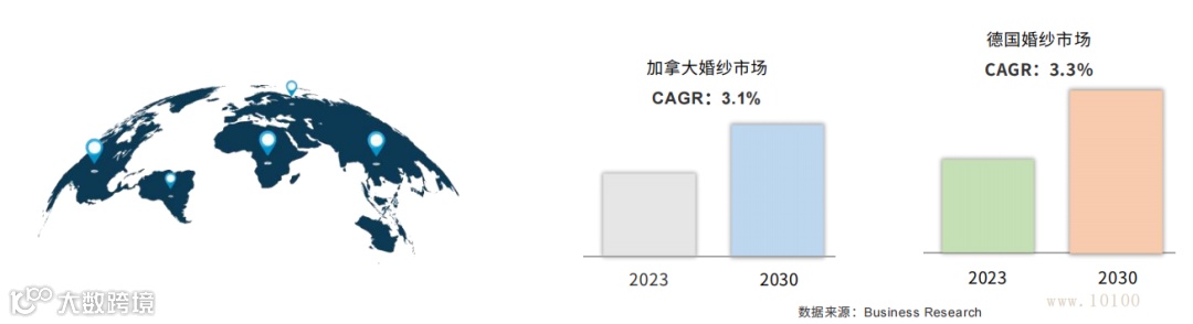 欧洲:预计到2026年,欧洲整体婚纱市场规模将达到190亿美元,根据CBI报告显示,德国、法国、意大利、波兰、西班牙和罗马尼亚是欧洲婚纱购买力最大的6个城市。其中,德国的复合年增长率预计约为3.3%。