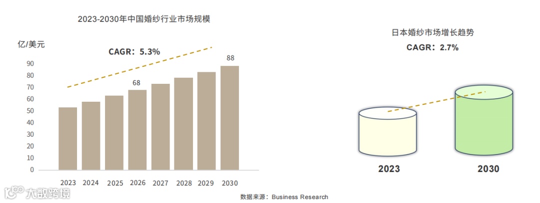 亚太:亚太地区是当前增速最快的婚纱市场之一,中产阶级崛起、可支配收入增加等因素,都促进亚太地区婚纱市场的增长。中国和印度,由于人基数庞大,成为亚太地区婚纱市场的主导者。其中,中国作为世界第二大经济体,预计到 2030 年市场规模将达到 88 亿美元,复合年增长率为 5.3%,日本预计增长2.7%。而东南亚等新兴城市,由于城市化进程加快、流行文化熏陶,其市场潜力也日益凸显。