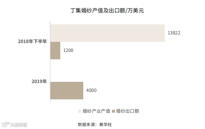 出口规模:数据显示, 2018年下半年,丁集婚纱产业产值达到10亿元人民币,其中30家国际贸易工厂将丁集婚纱销往美国和欧洲,带来了1200万美元的销售额,2019年,丁集镇的婚纱出口额达到了4000万美元。