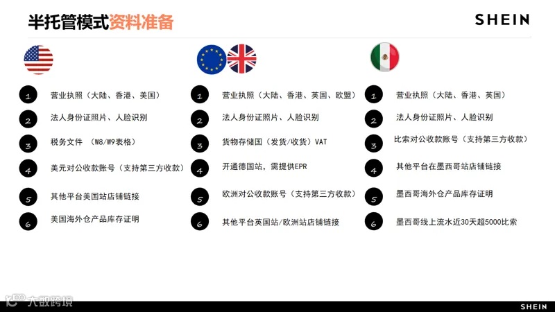 SHEIN半托管现在已经开通墨西哥、美国、英国还有欧盟(德法西意)4个站点,其他市场在陆续开通中。