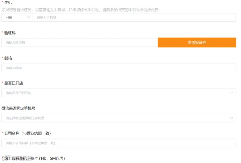 点击链接之后,需要填写姓名、手机、验证码、邮箱、是否已开店、公司名称、主营类目、公司类型、品牌性质,同时需要上传营业执照。公司类型中有自有工厂、贸易商(有合作工厂)、贸易商(无合作工厂)三种类型