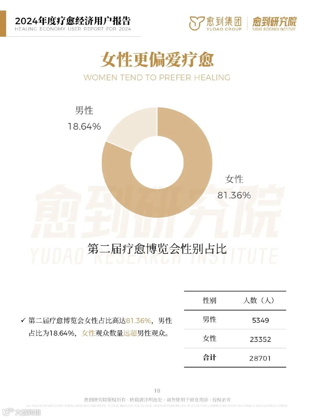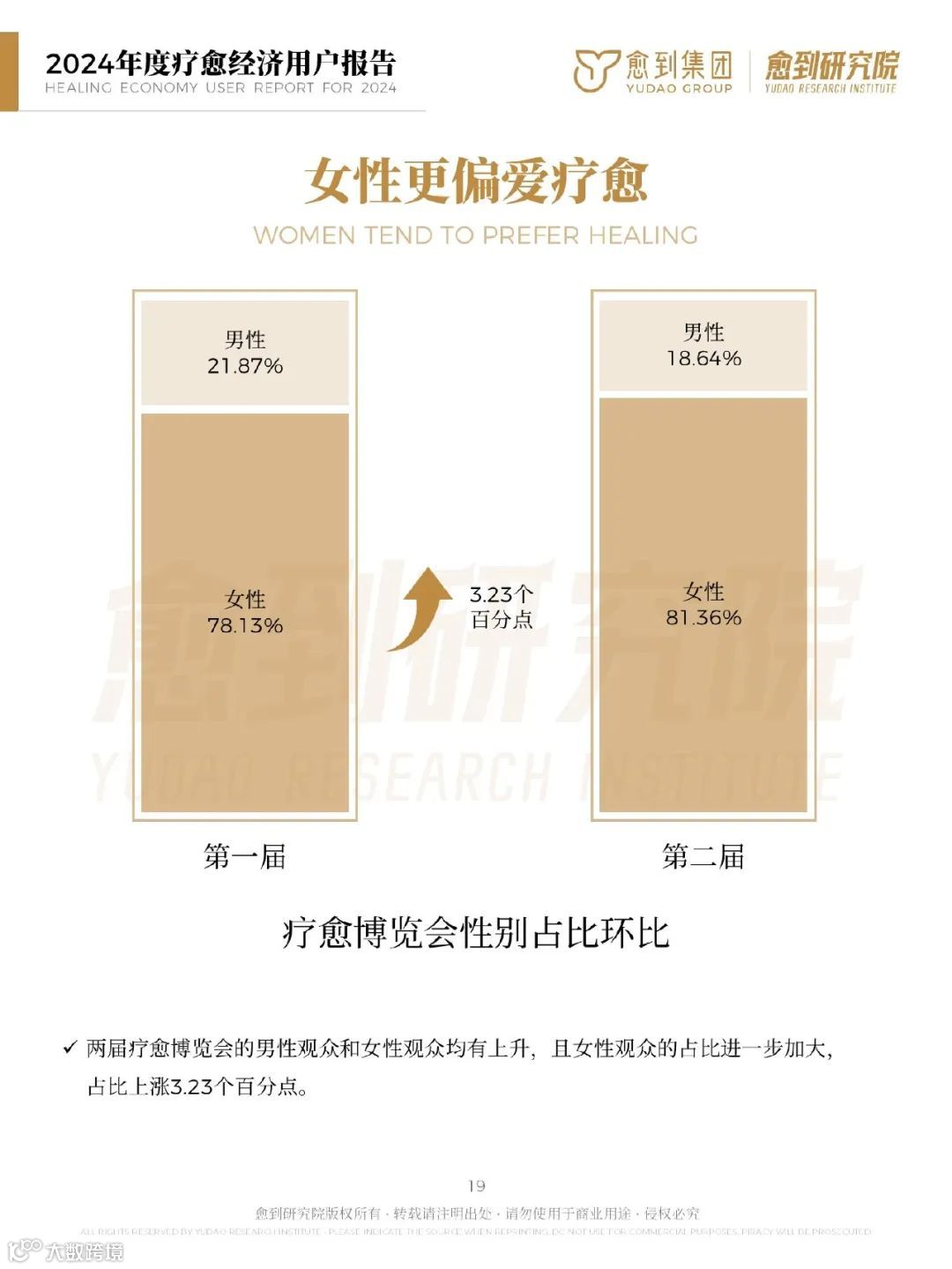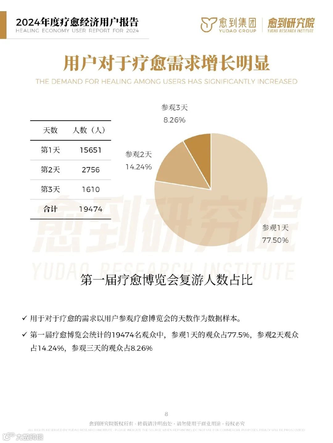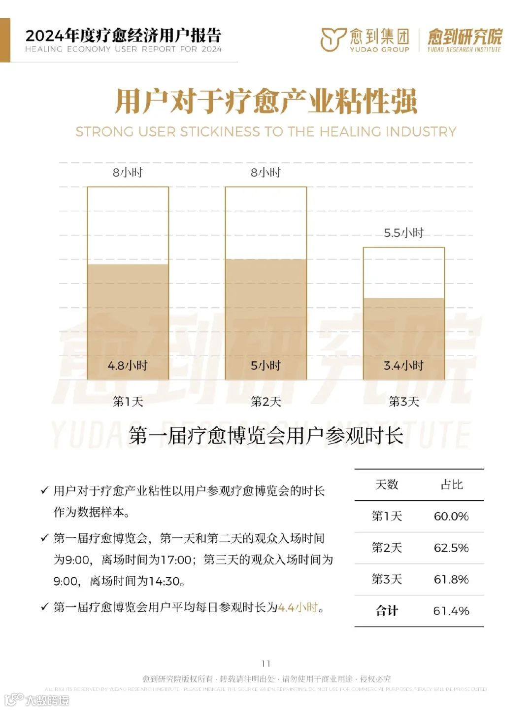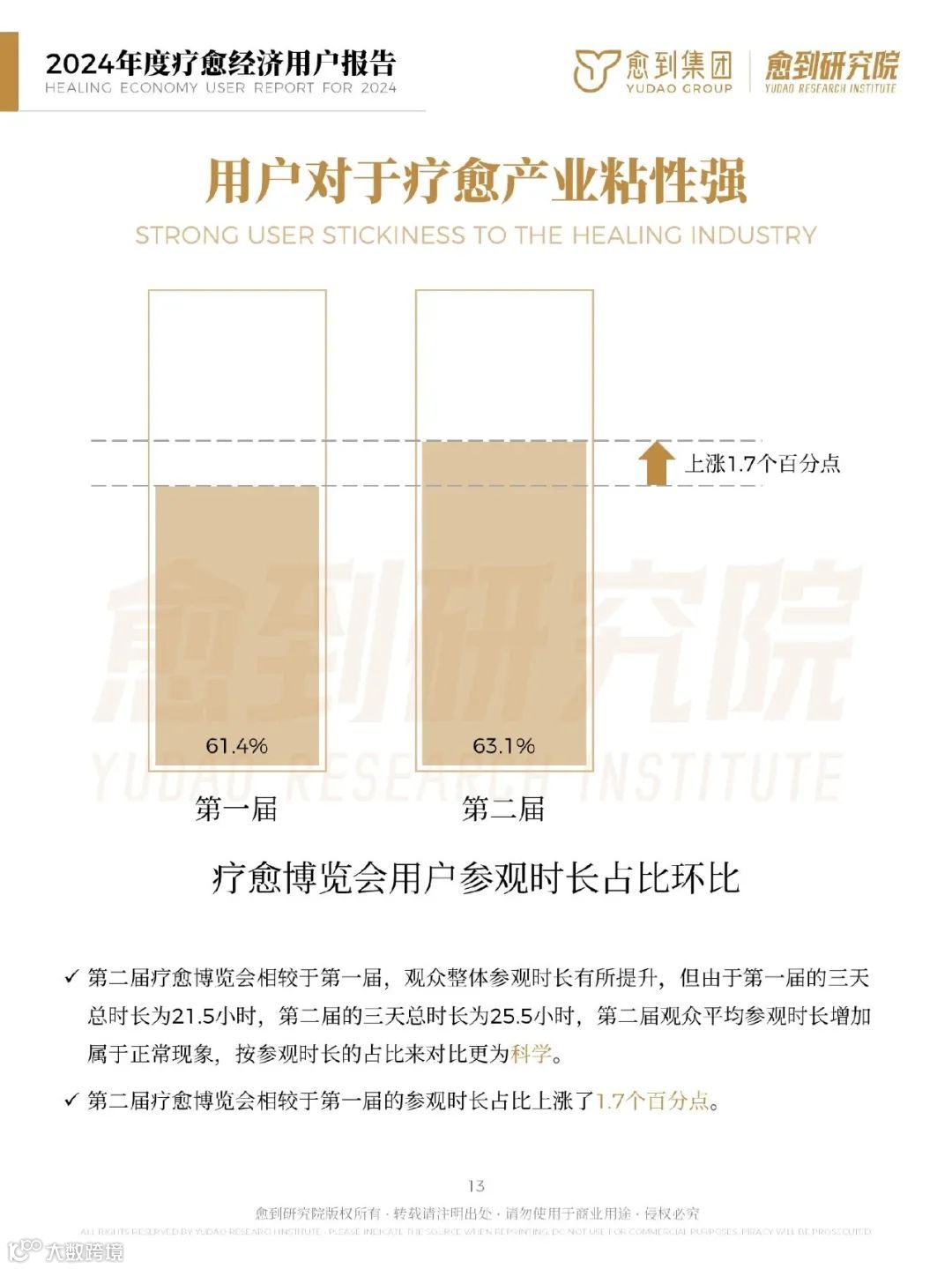 随着人们对疗愈的重视,用户对于疗愈的接受度也大大提升。以疗愈博览会为例,其参观人数和人次环比呈增长态势,复游人数比例也有所增加。用户在疗愈博览会上的参观时长也反映出对疗愈内容的感兴趣程度,具体时长等数据都表明用户对疗愈产业粘性强。