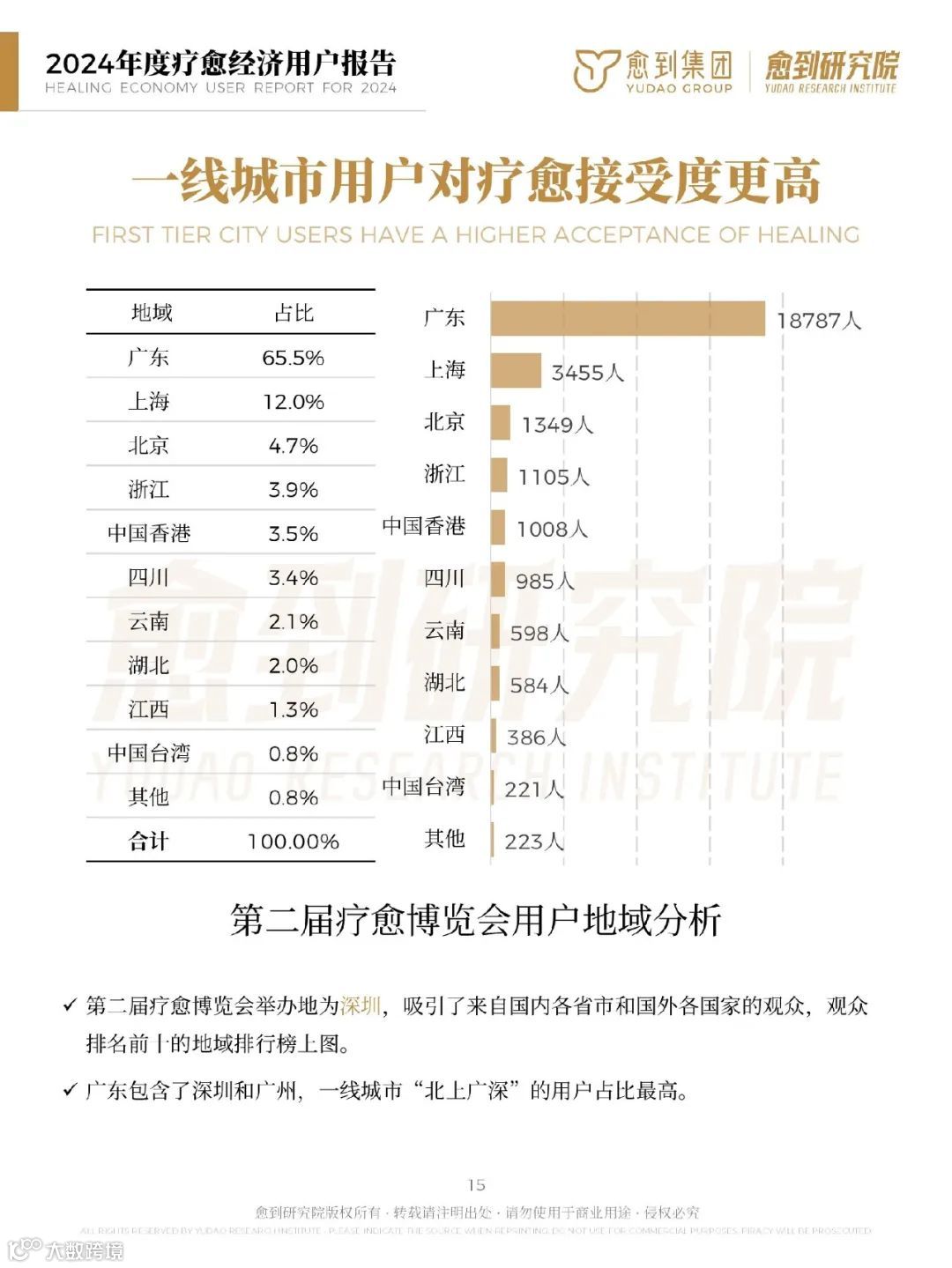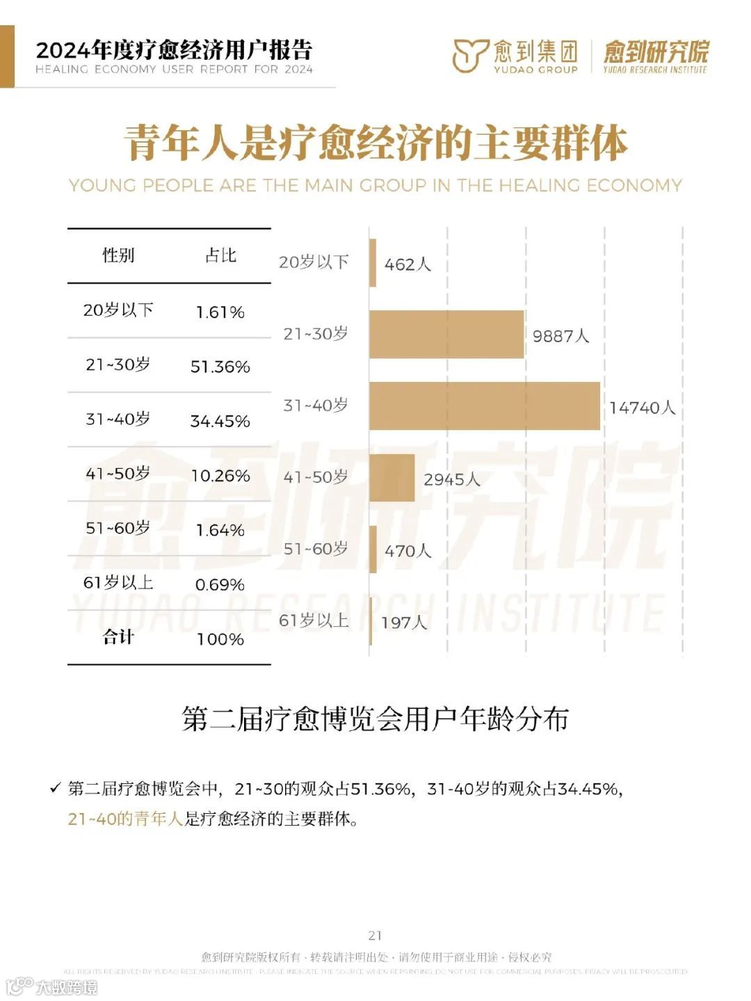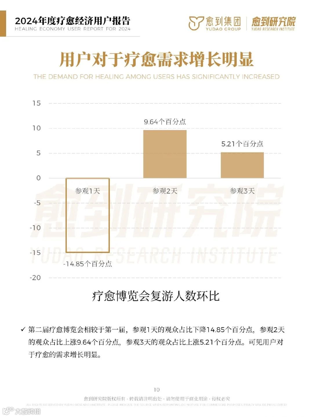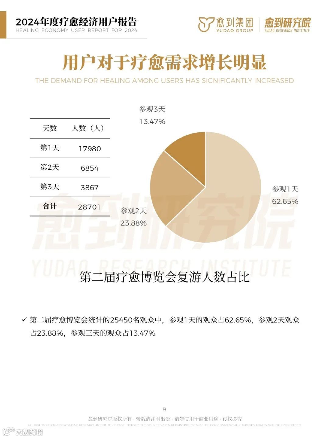 随着人们对疗愈的重视,用户对于疗愈的接受度也大大提升。以疗愈博览会为例,其参观人数和人次环比呈增长态势,复游人数比例也有所增加。用户在疗愈博览会上的参观时长也反映出对疗愈内容的感兴趣程度,具体时长等数据都表明用户对疗愈产业粘性强。