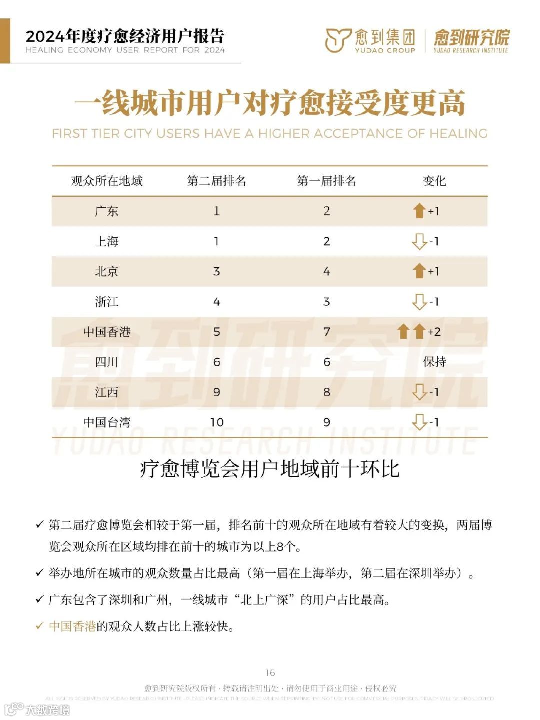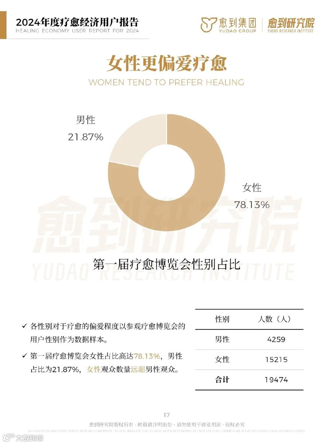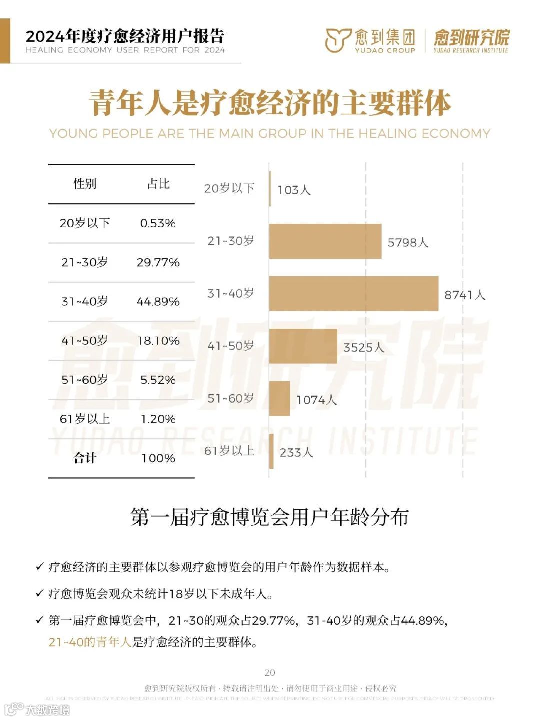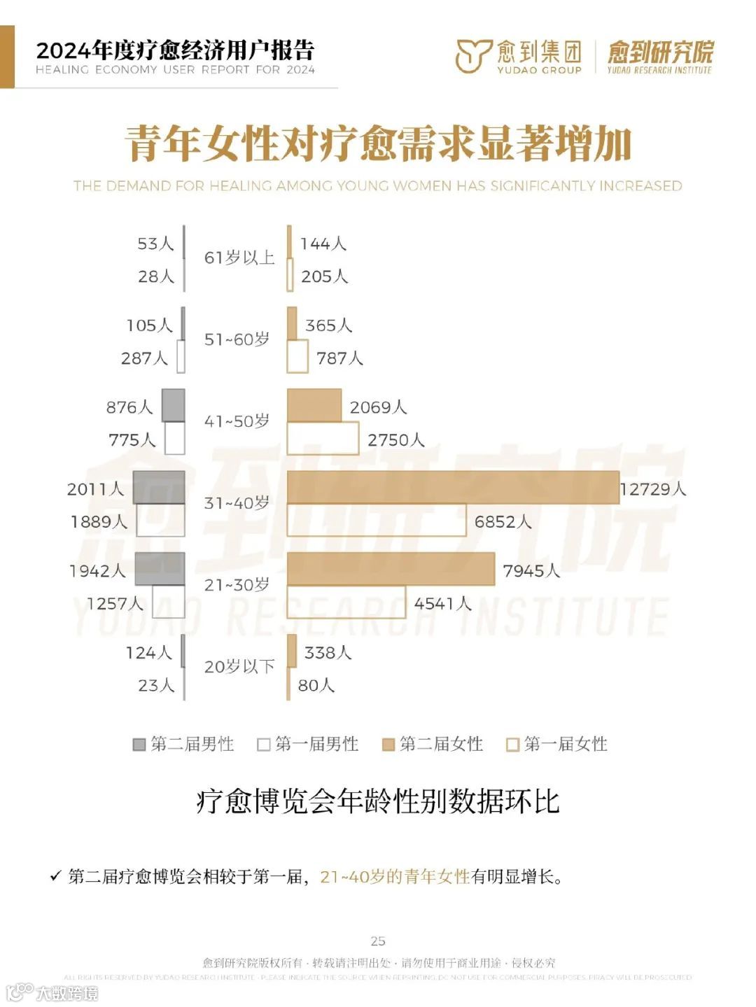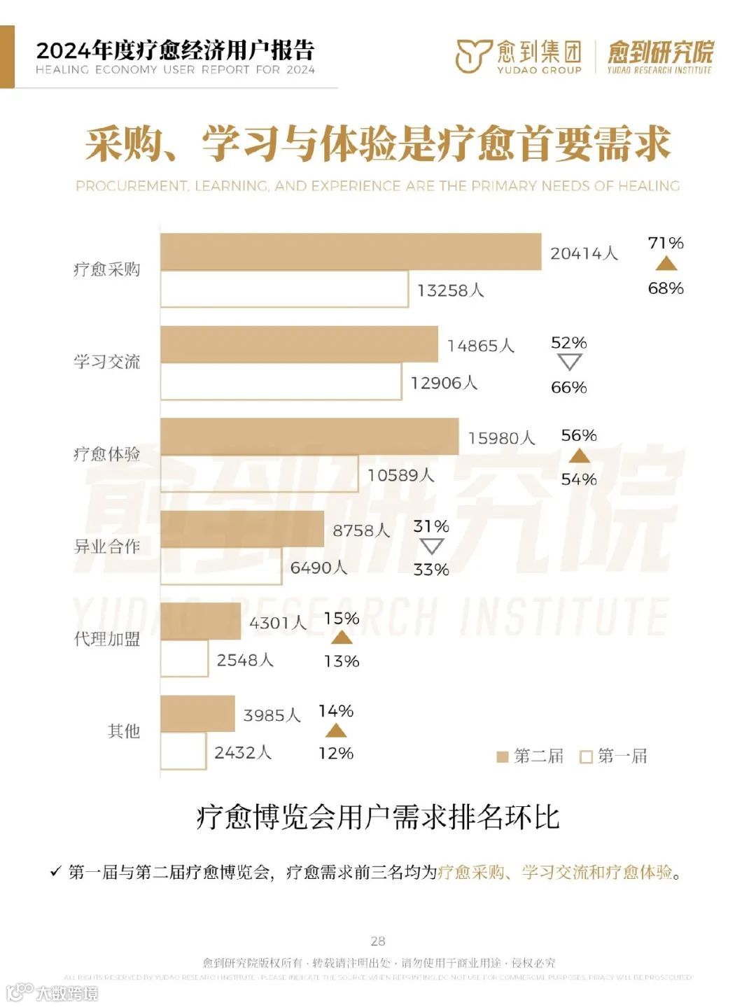 随着人们对疗愈的重视,用户对于疗愈的接受度也大大提升。以疗愈博览会为例,其参观人数和人次环比呈增长态势,复游人数比例也有所增加。用户在疗愈博览会上的参观时长也反映出对疗愈内容的感兴趣程度,具体时长等数据都表明用户对疗愈产业粘性强。