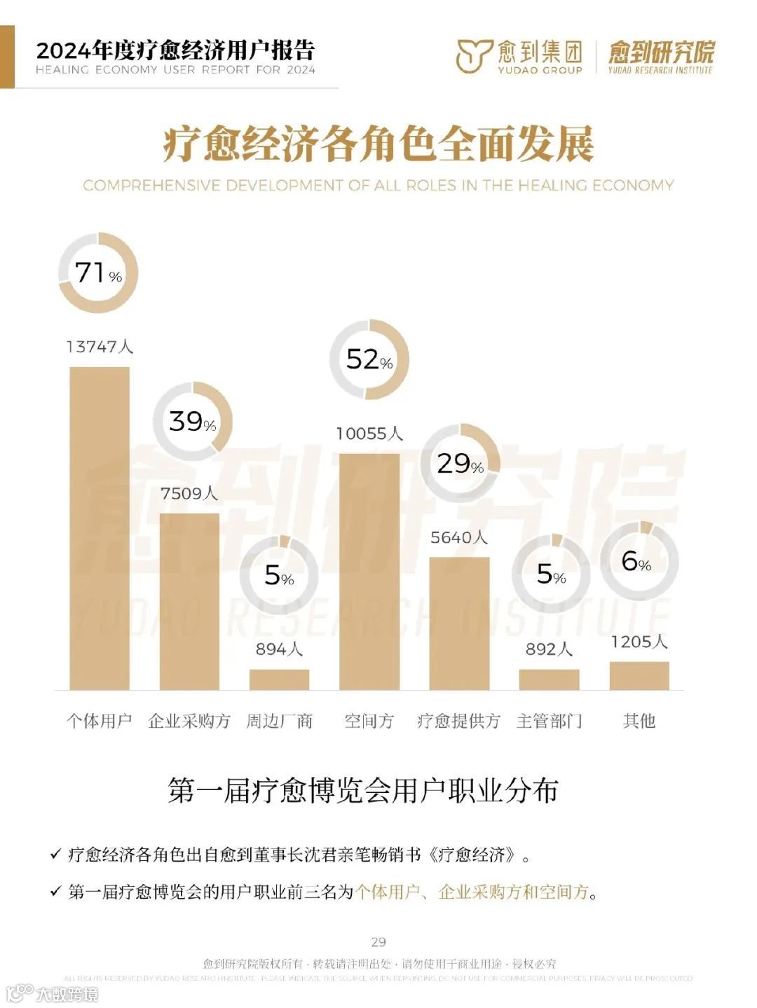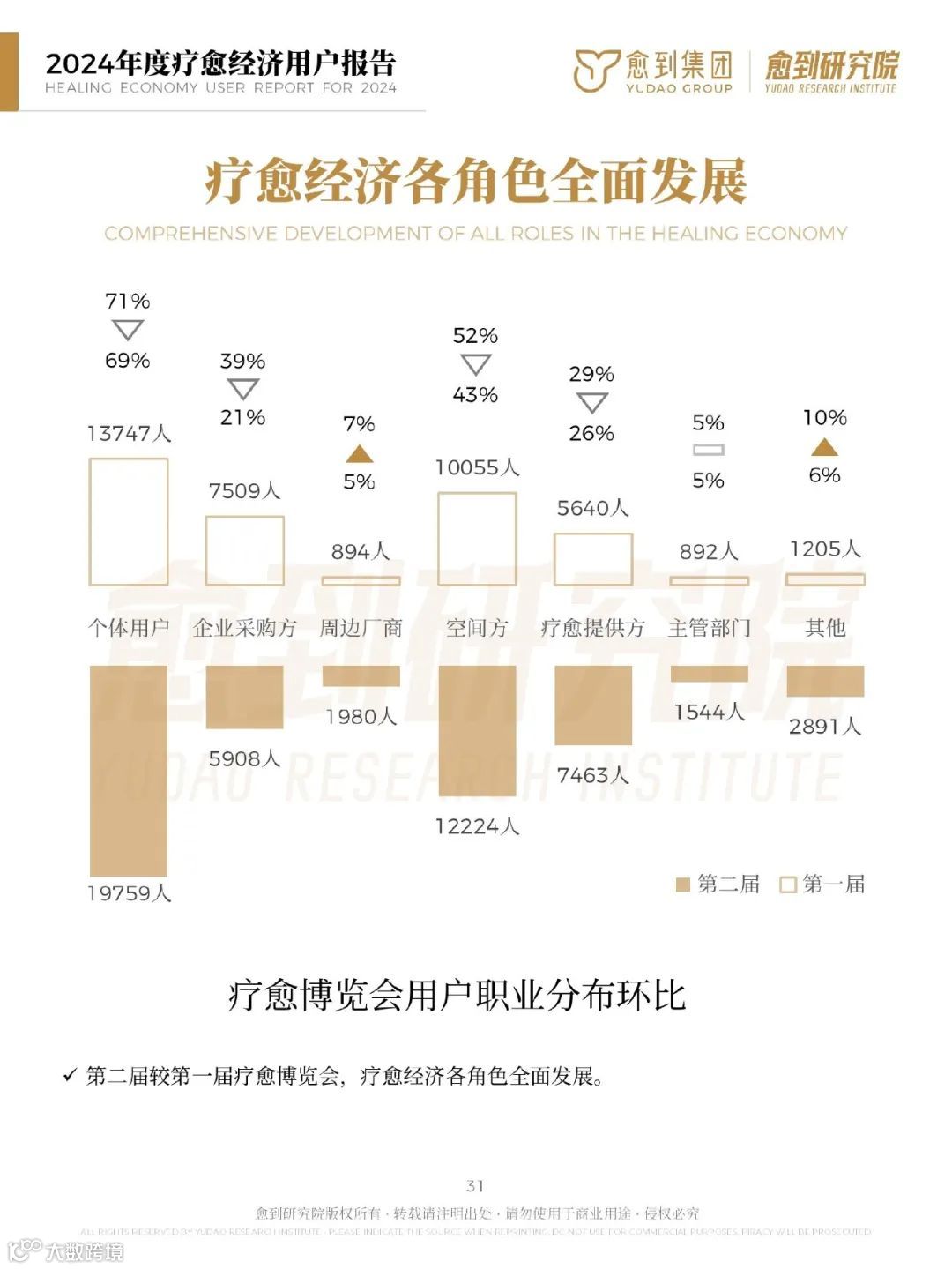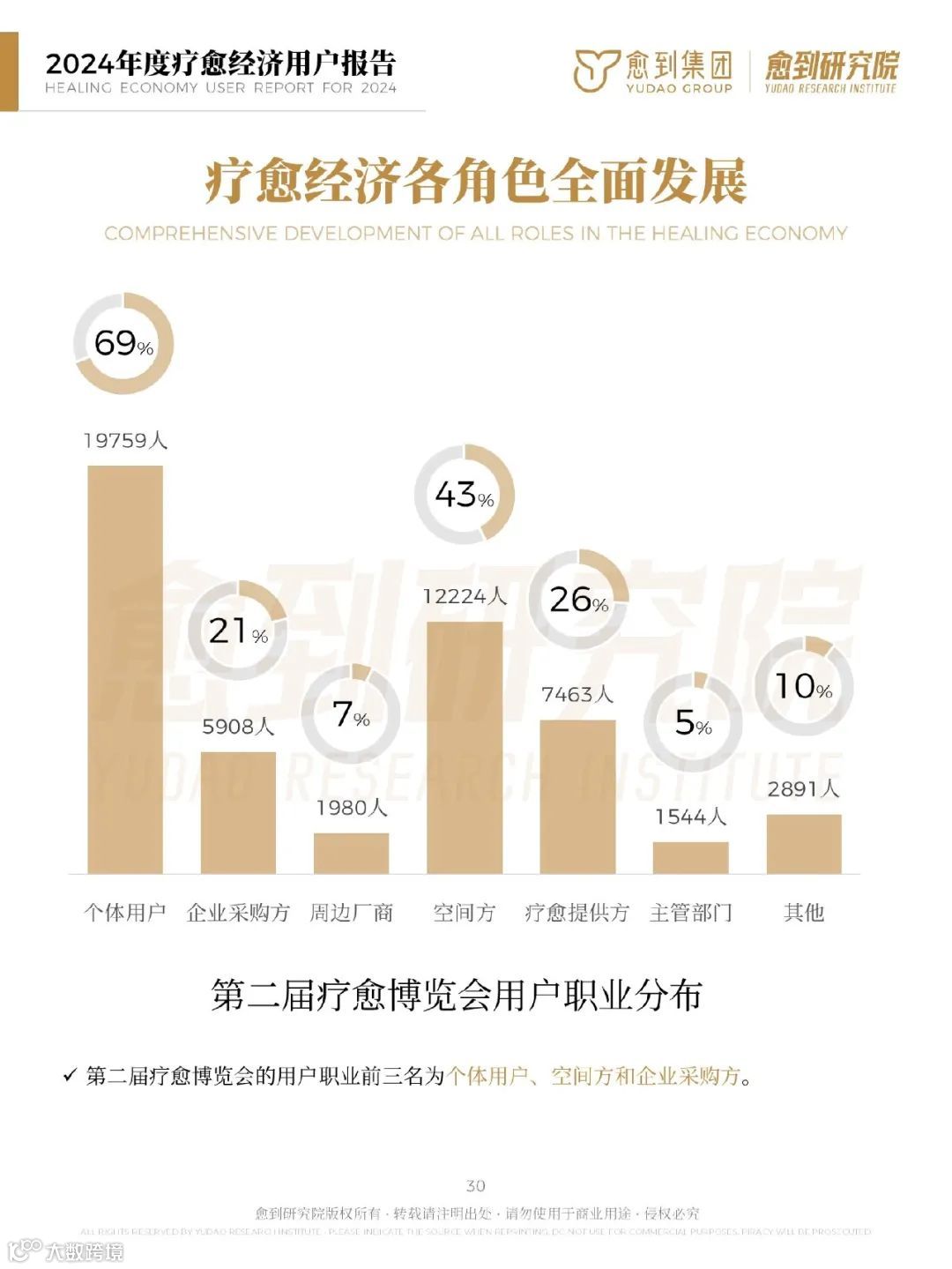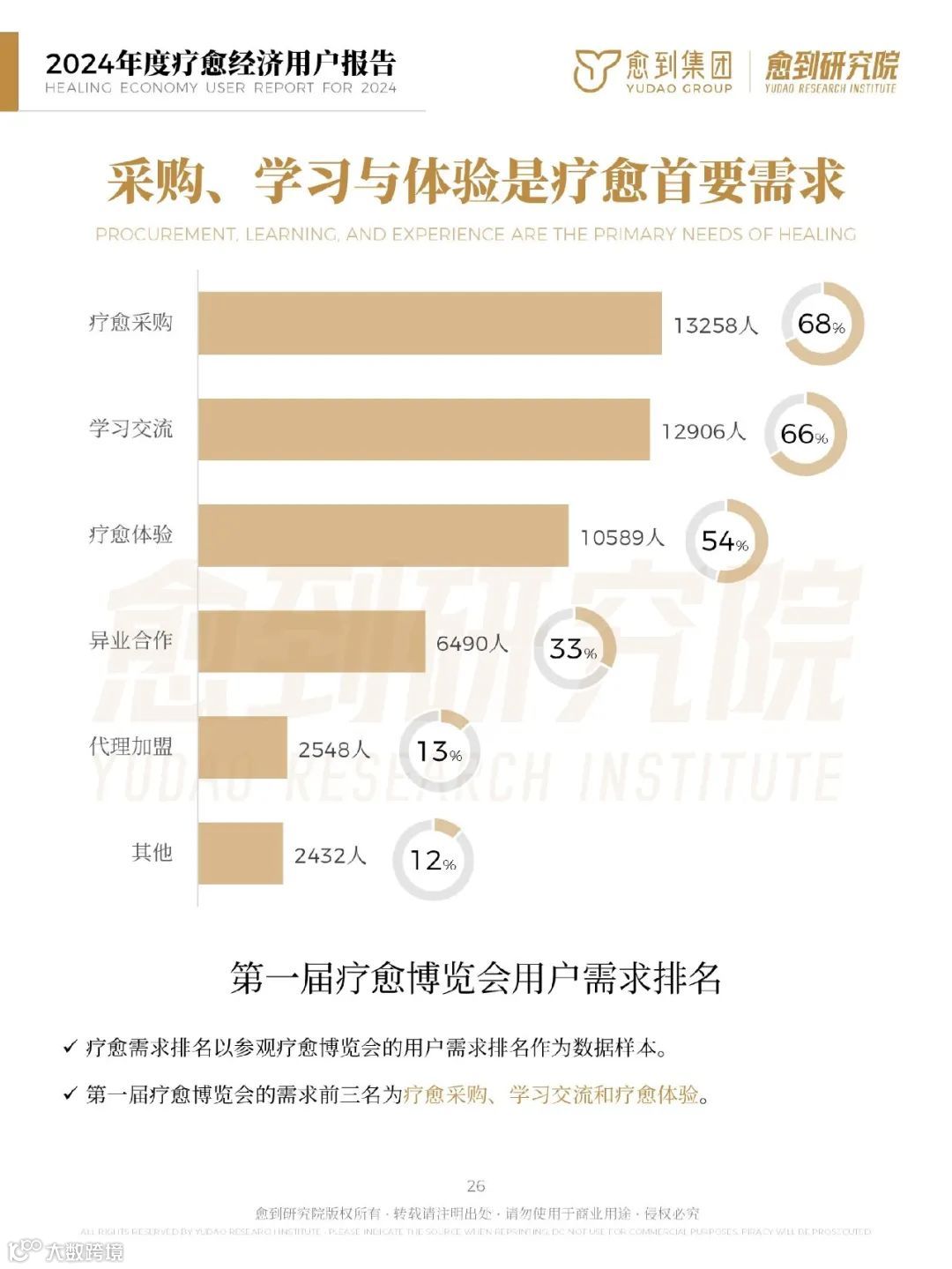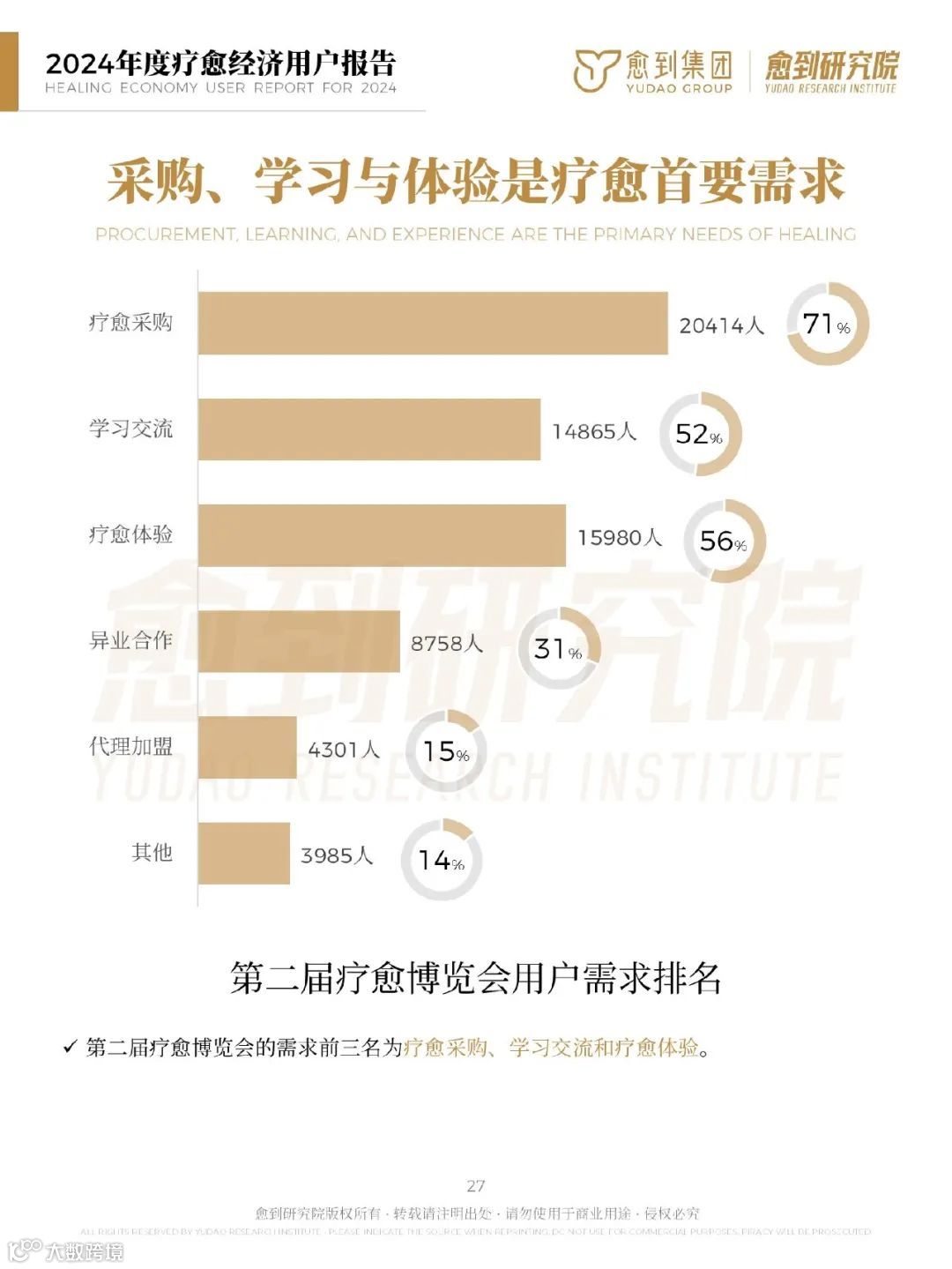 随着人们对疗愈的重视,用户对于疗愈的接受度也大大提升。以疗愈博览会为例,其参观人数和人次环比呈增长态势,复游人数比例也有所增加。用户在疗愈博览会上的参观时长也反映出对疗愈内容的感兴趣程度,具体时长等数据都表明用户对疗愈产业粘性强。