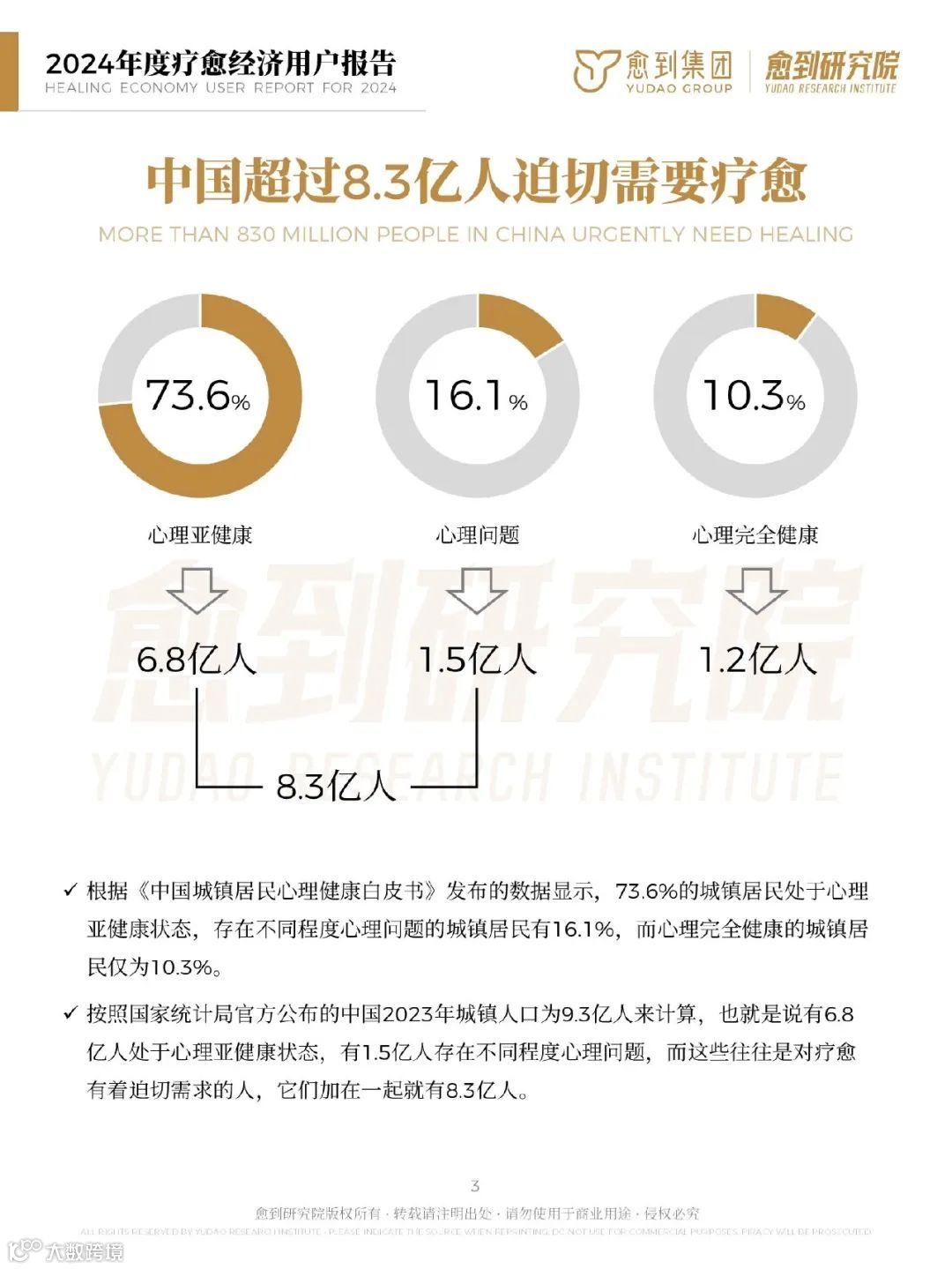 根据报告的数据,在中国超过8.3亿人迫切需要疗愈。这一庞大的数字背后有着深刻的缘由。从心理健康状况来看,73.6%的城镇居民处于心理亚健康状态,存在不同程度心理问题的城镇居民达16.1%,而心理完全健康的城镇居民仅为10.3%。按照国家统计局2023年城镇人口为9.3亿人计算,得出有6.8亿人处于心理亚健康状态,1.5亿人存在不同程度心理问题,这些人群构成了疗愈需求的主力军。