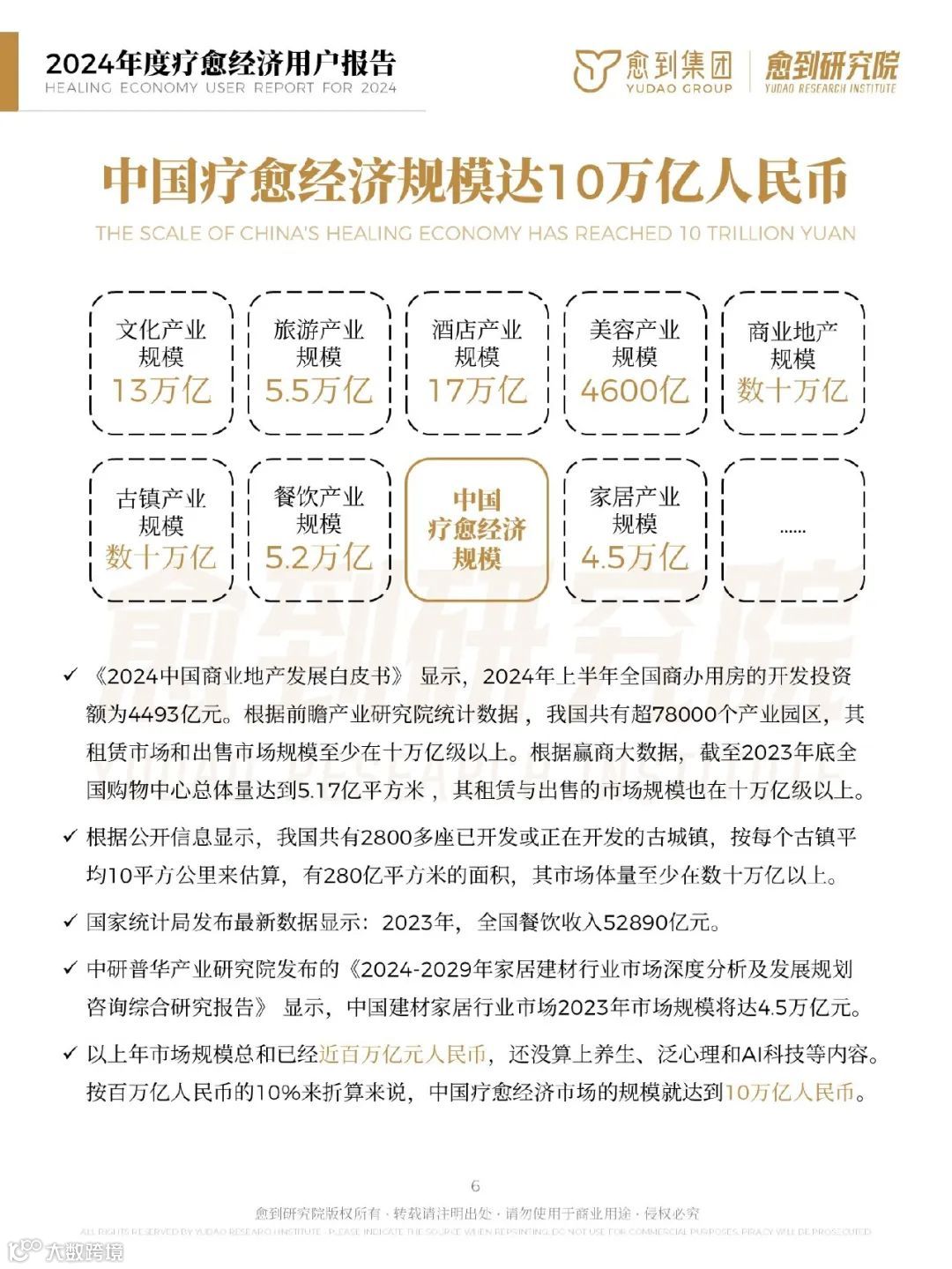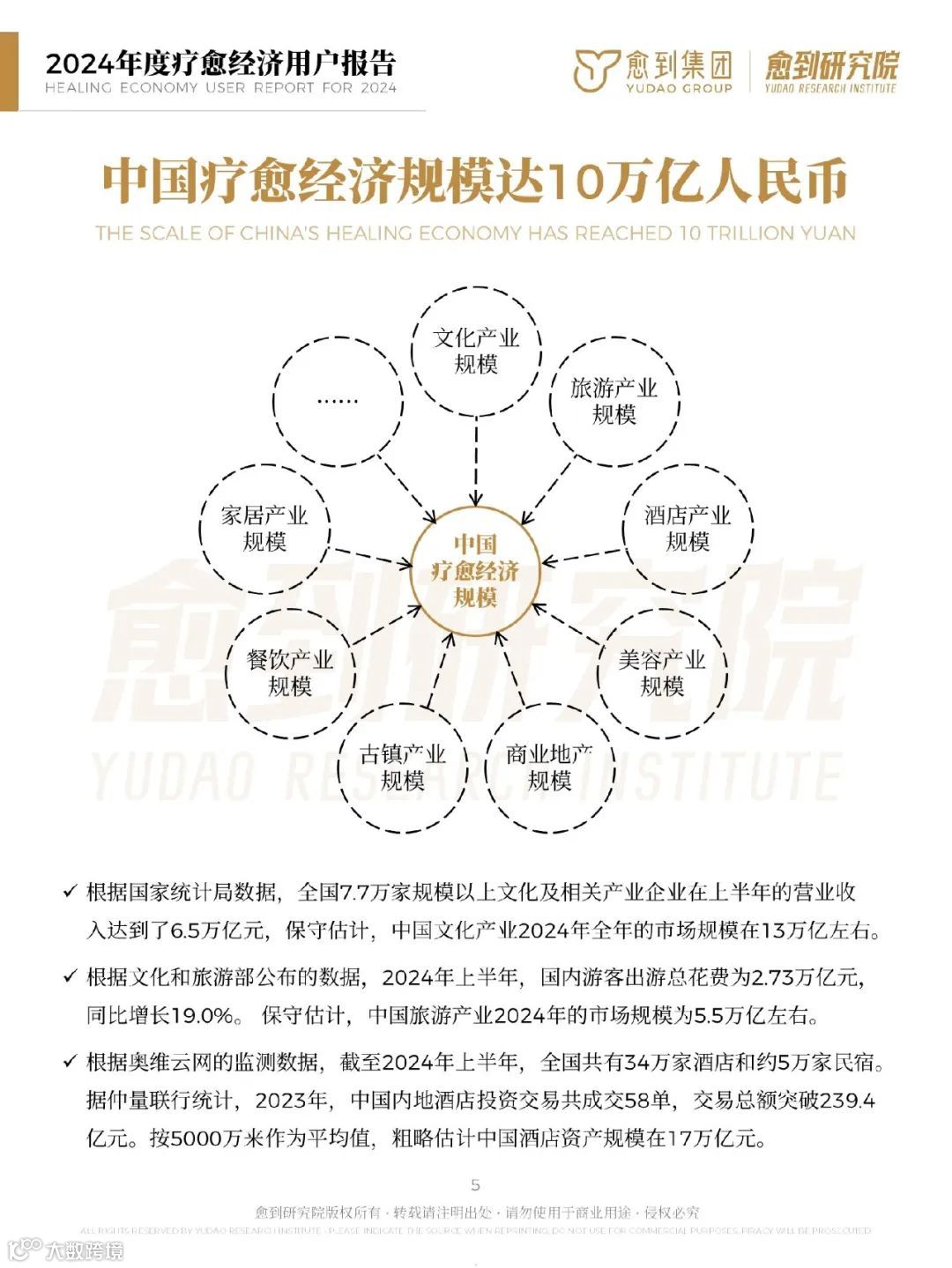 疗愈经济的规模同样令人惊叹。在文化产业方面,全国7.7万家规模以上文化及相关产业企业2024年上半年营业收入达6.5万亿元,保守估计全年市场规模达13万亿左右;旅游产业2024年上半年国内游客出游总花费为2.73万亿元,同比增长19.0%,保守估计2024年市场规模为5.5万亿左右;酒店产业方面,截至2024年上半年,全国有34万家酒店和约5万家民宿,虽然具体金额难以精确统计,但规模相当可观。美容产业、商业地产、古镇产业、餐饮产业、家居产业等众多相关产业的发展,按照其各自规模相加总和已经近百万亿元人民币,按百万亿人民币的10%折算,中国疗愈经济市场规模就达10万亿人民币。这充分表明疗愈经济已经成为一个极为庞大的产业体系。