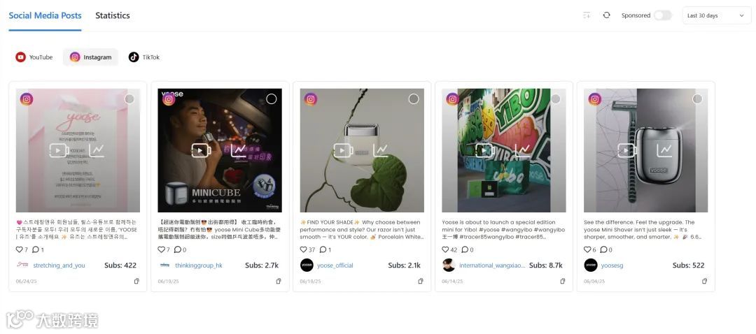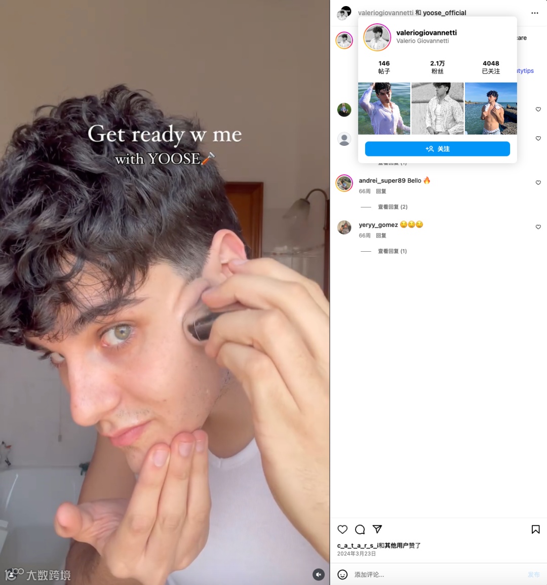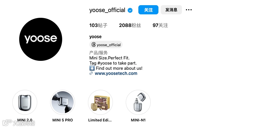 在Instagram上,其官方账号还处于“从0到1”阶段,粉丝数仅有2088人,正好落在1 k–5 k的小型品牌账号的区间内。在这样的小基数环境下,Yoose却仍凭借“高质感内容+精准红人合作”的方式,实现其他出海品牌数万乃至数十万粉丝才能达到的效果。