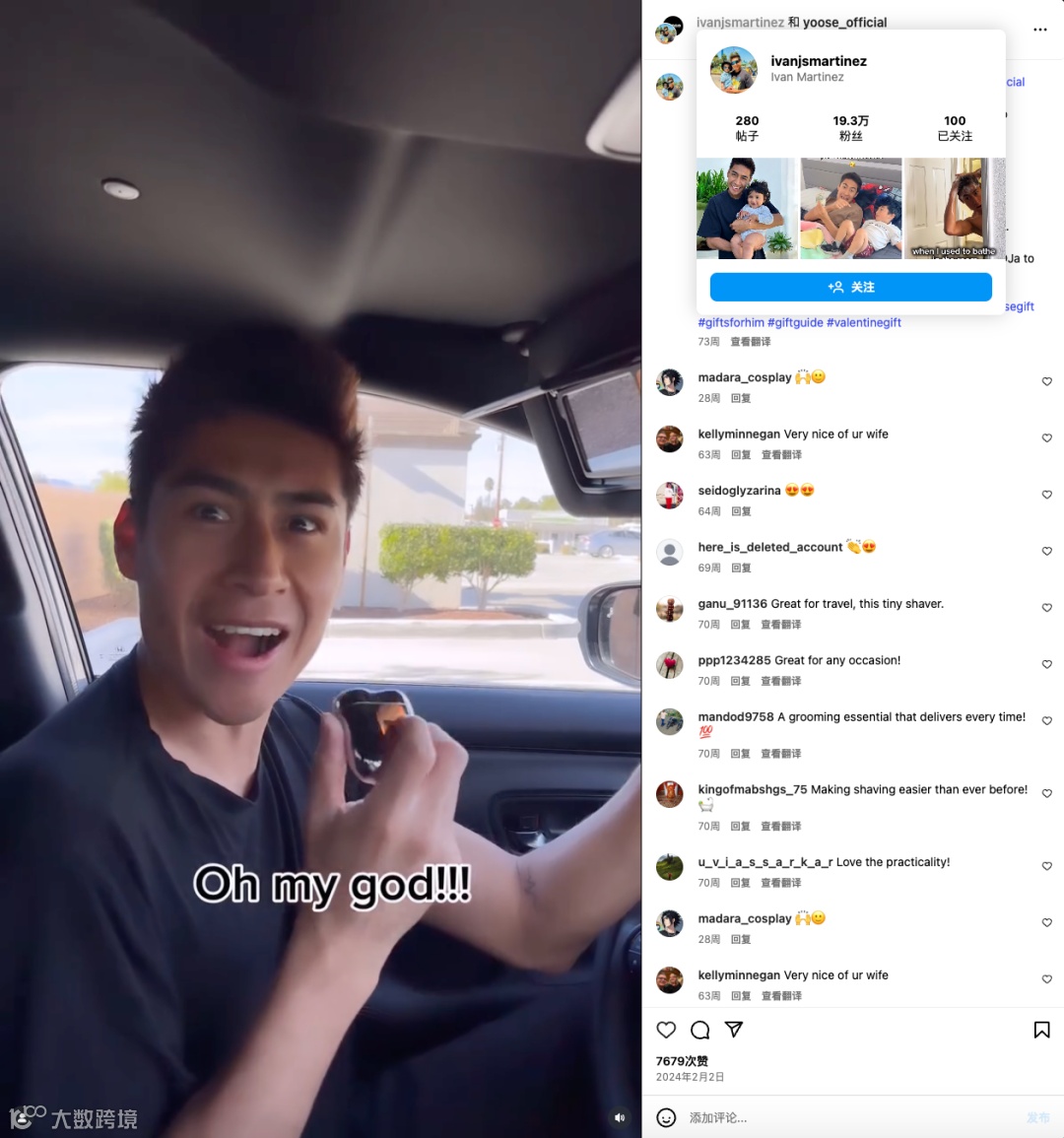 Ivan Martinez,非常活跃的家庭博主,内容集中在对年轻带孩夫妻日常生活的搞笑演绎。粉丝集以18–34 岁为主,与Yoose重点开拓的海外年轻旅行与都市白领人群高度重合。