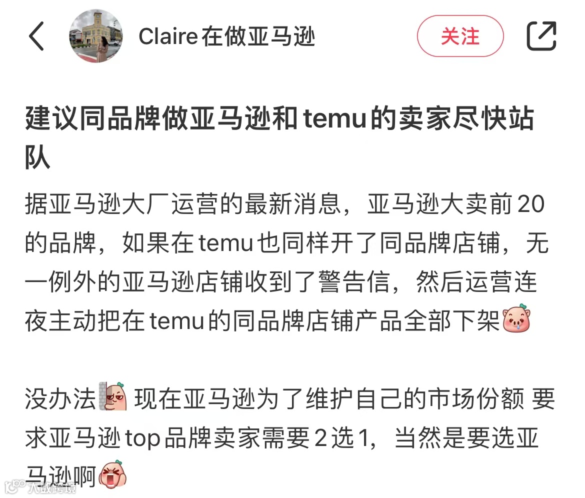 12月20日,有商家在社交媒体上爆料,根据某亚马逊大厂运营的最新消息,亚马逊为了维持自己的市场份额,强制要求TOP品牌站队“二选一”,商城大卖前20的品牌,如果在Temu也开了同品牌店铺,无一例外都收到了警告信。