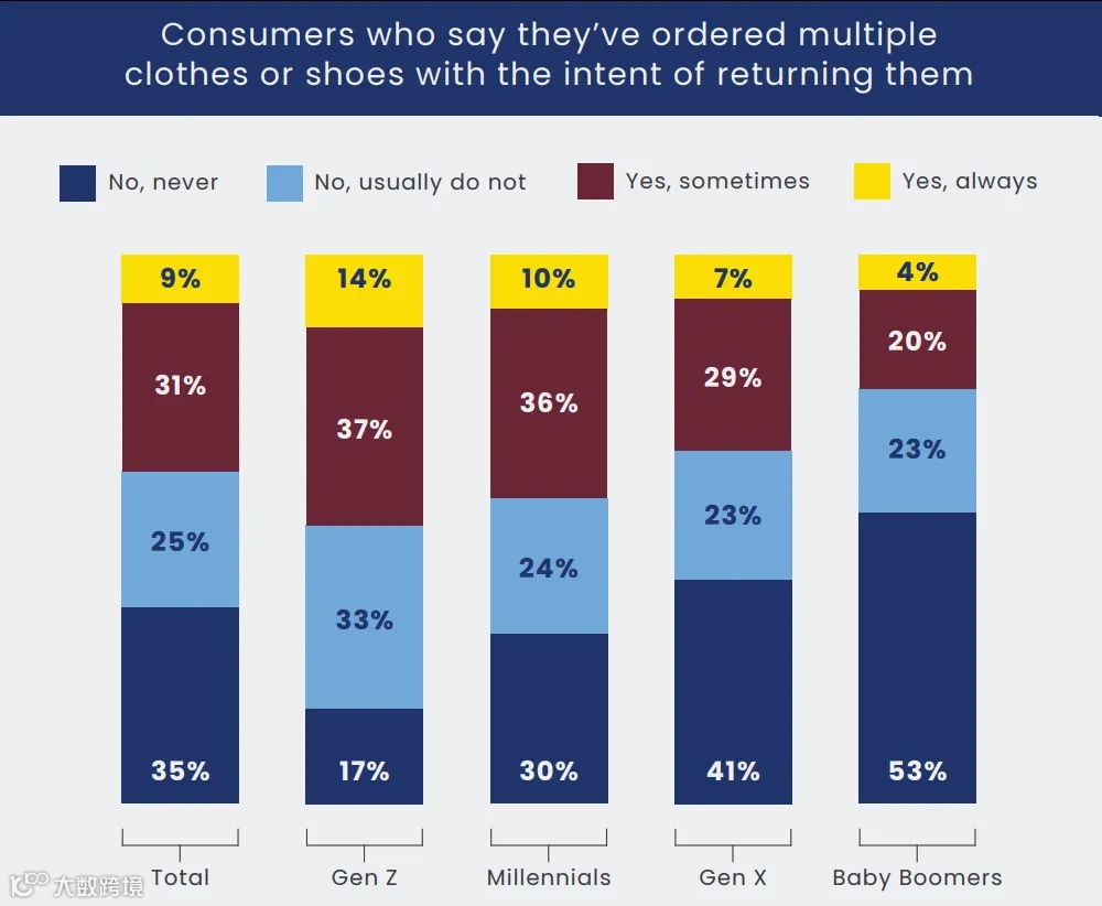 分析报告提到,有消费者16%承认他们只是为了在社交活动中短暂使用,还有15%的人是为了摆拍。且往往服装鞋类的退货率是最高的类别,在TikTok平台上,关于#KeepOrReturn的话题高达1100万个。有51%的Z世代消费者承认了滥用了退货行为,比如在一家店同时下单多件产品后,但申请退货退款后,只退回了其中一部分。