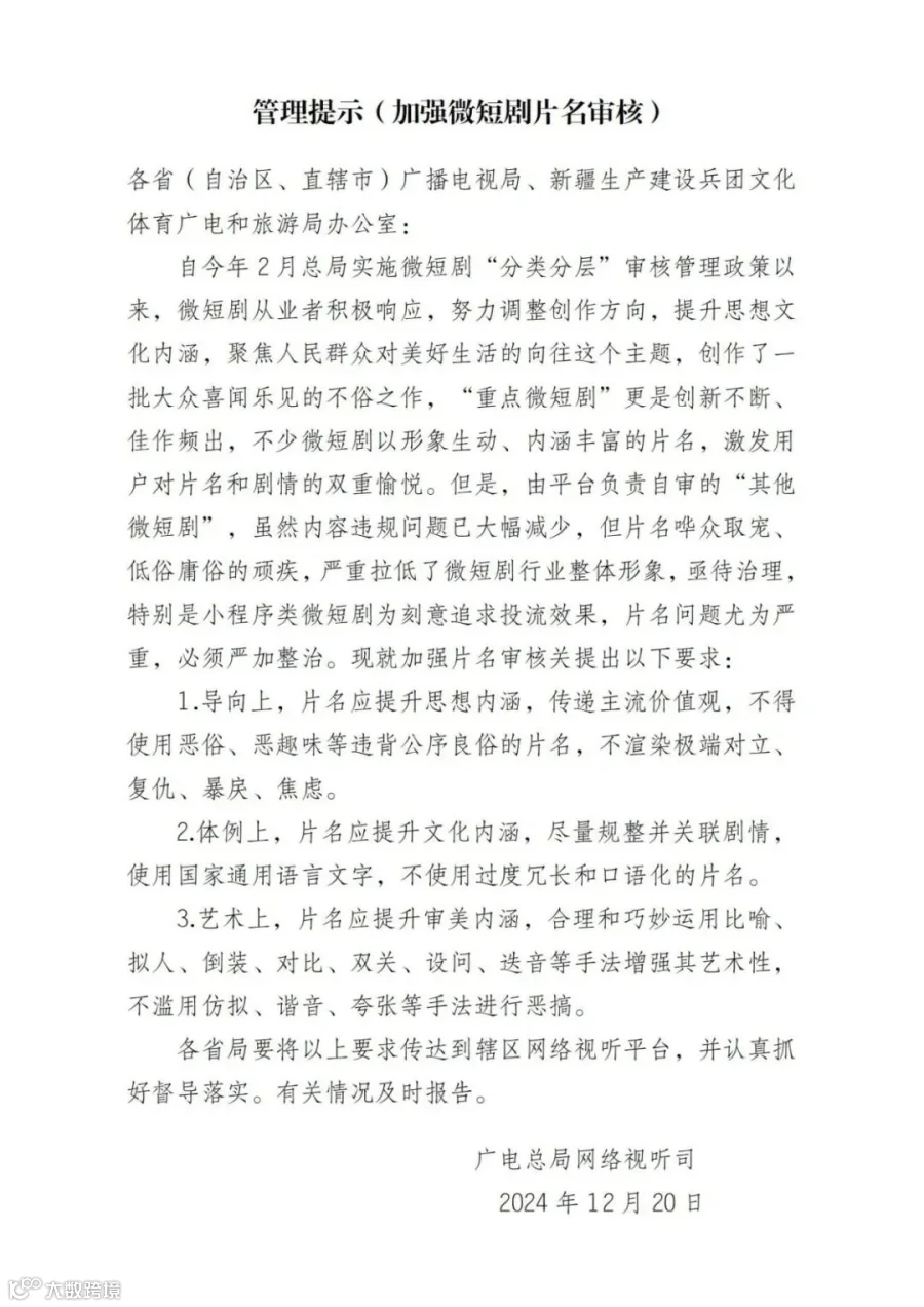 近日,国家广播电视总局网络视听司发布最新管理提示,针对微短剧片名的不良倾向进行及时纠偏,并在导向、体例、艺术等方面提出新要求,旨在提升微短剧的整体质量和艺术性,促进行业的健康发展。