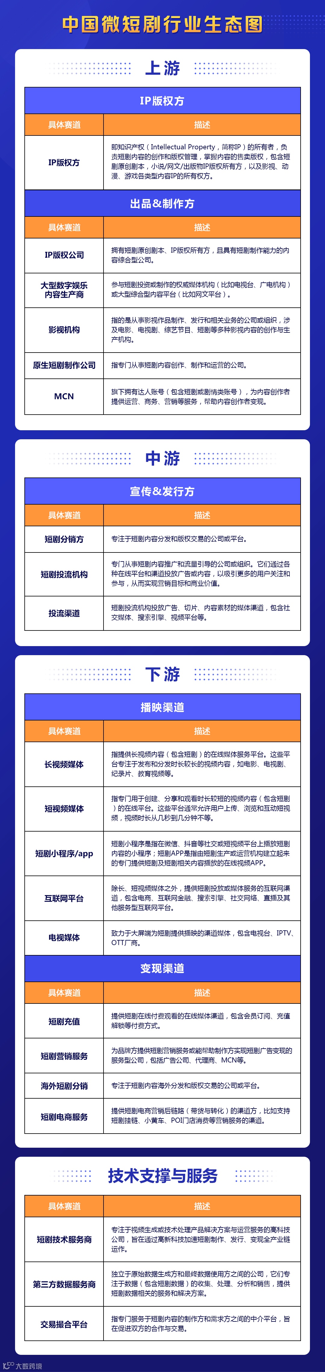 为系统梳理当前中国微短剧行业发展状况与产业脉络,《中国微短剧行业生态图(2024版)》正式开启征集通道。该《生态图》由勾正科技发起,联合短剧新势力、短剧内行人、剧风营等媒体伙伴共同招募和发布,将为从业者呈现一幅全面、专业,具备参考价值的短剧行业全景图。
