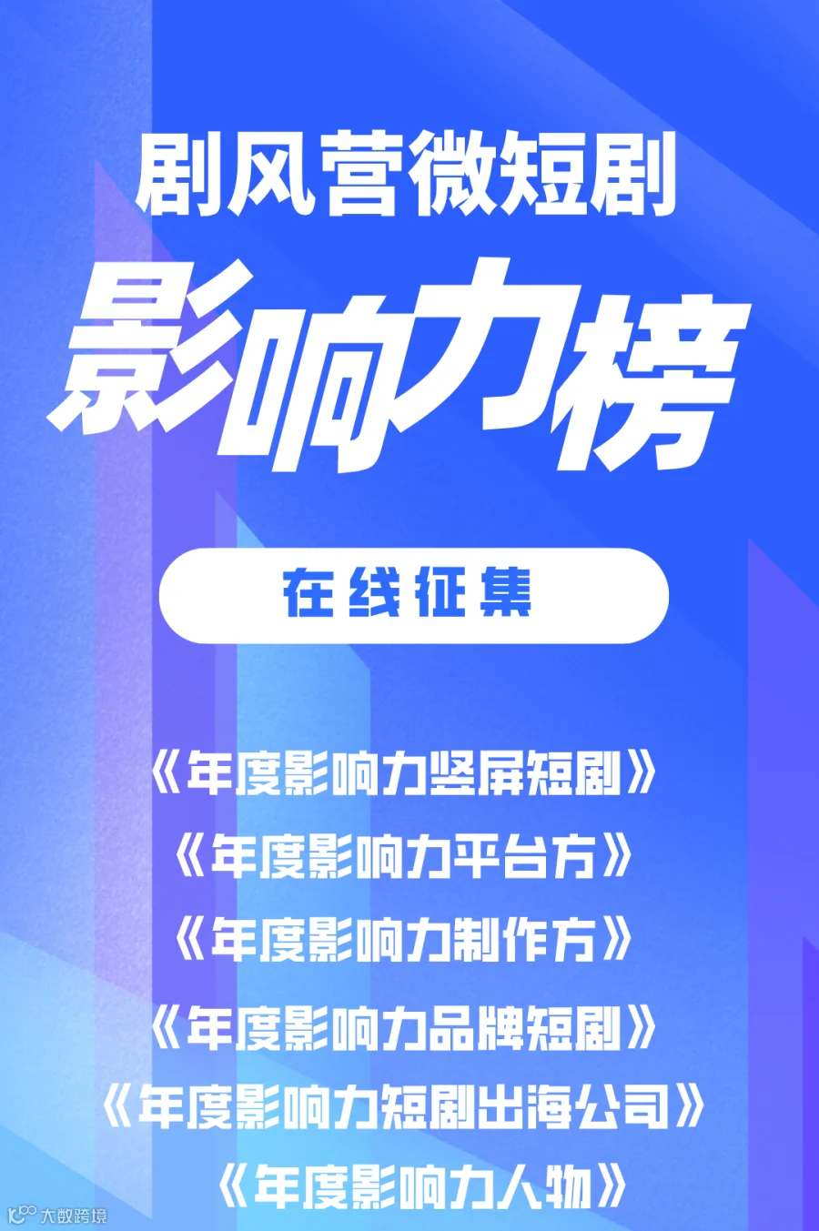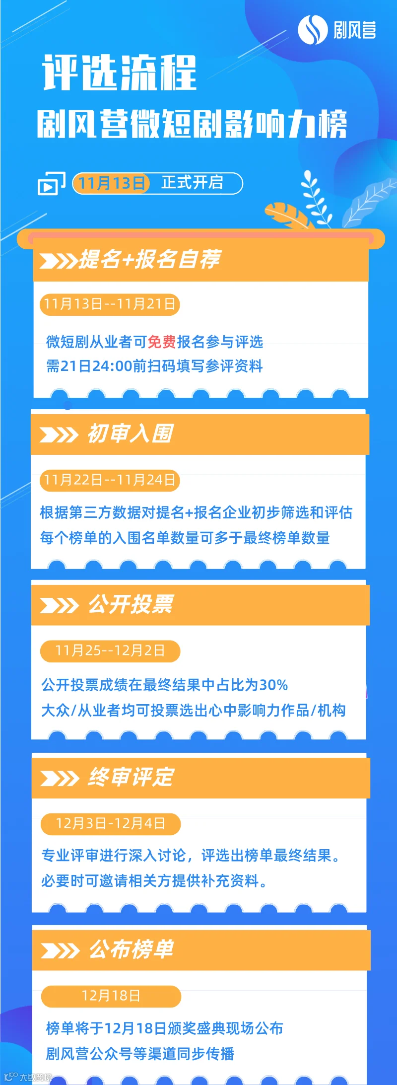 《剧风营微短剧影响力榜》系列榜单包括《年度影响力竖屏短剧》、《年度影响力平台方》、《年度影响力制作方》、《年度影响力品牌短剧》(含文旅品牌)、《年度影响力短剧出海公司》、《年度影响力人物》6大板块,将通过“提名+自荐——初审入围——公开投票——终审评定”4个环节,最终评选出「剧风营微短剧影响力榜」。