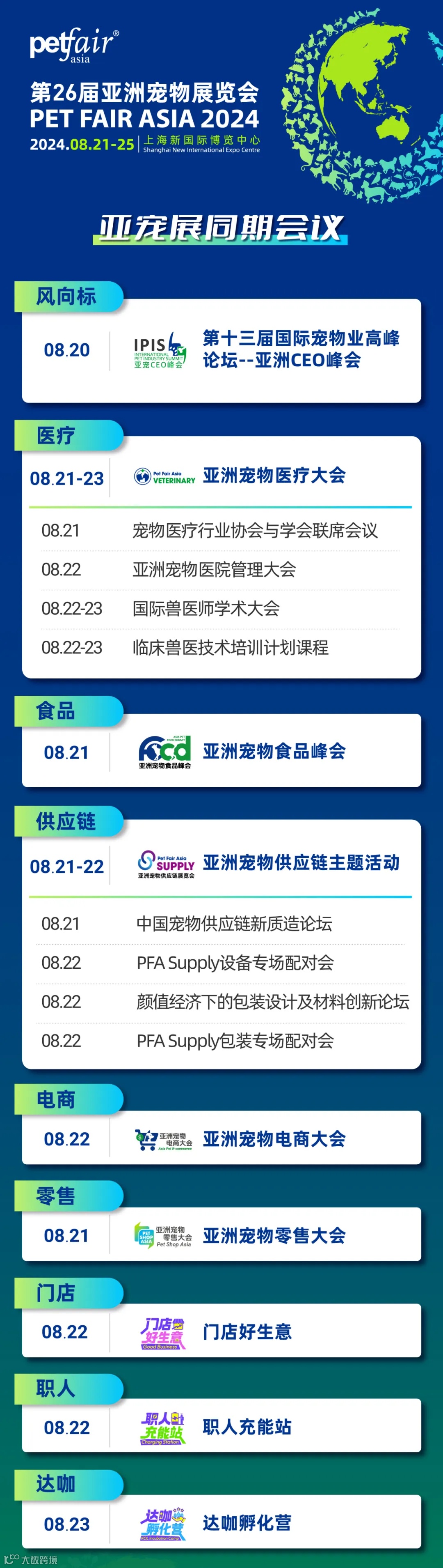 在这样的新常态下,从业者如何抓紧修炼内功,亚洲宠物展同期会议,医疗大会、食品峰会、电商大会、零售大会等行业峰会为各细分赛道提供交流平台;新设供应链主题系列活动,助力提升产业新质生产力,高效链接上下游资源;更有门店好生意、职人充能站、达咖孵化营等深度落地小课,为从业者未来做谋划,修炼内功,在危机退潮后获得更大发展空间。