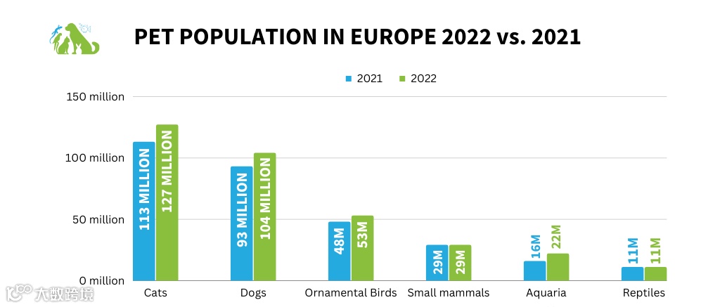 欧洲家庭的宠物渗透率较高,并将宠物视为家庭的一部分。根据Statista的数据,超过9000万个欧洲家庭至少养有一只宠物,其中猫最受欢迎。德国、西班牙、意大利和法国是拥有狗和猫数量最多的地区。