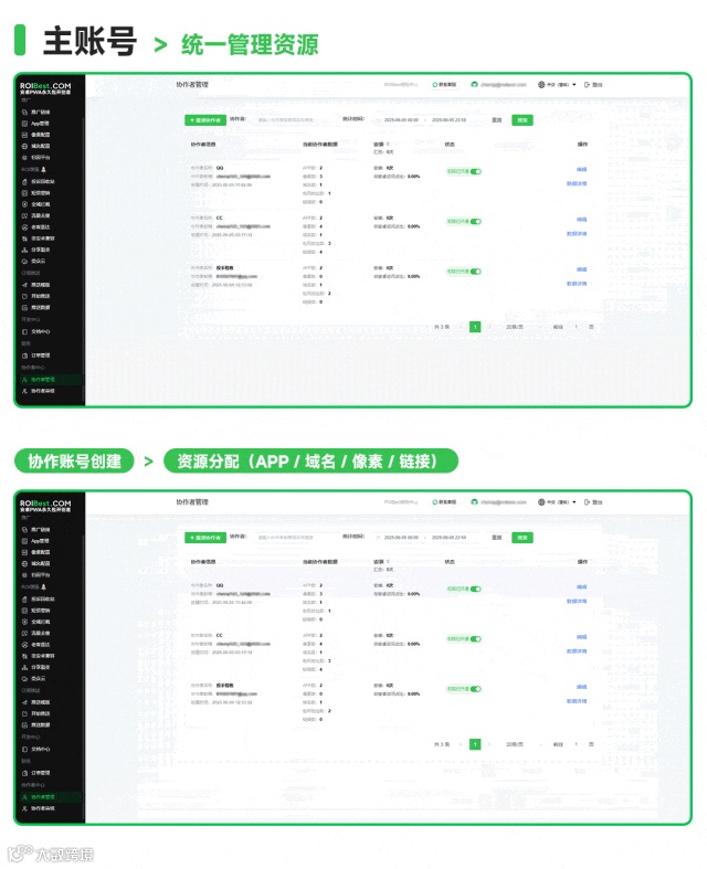 无论是在推广链接分配协作者,还是在协作者管理分配协作者,统一都会记录并展示在【协作者管理】列表,并展示分配的App、域名、像素、H5/包网地址数量。