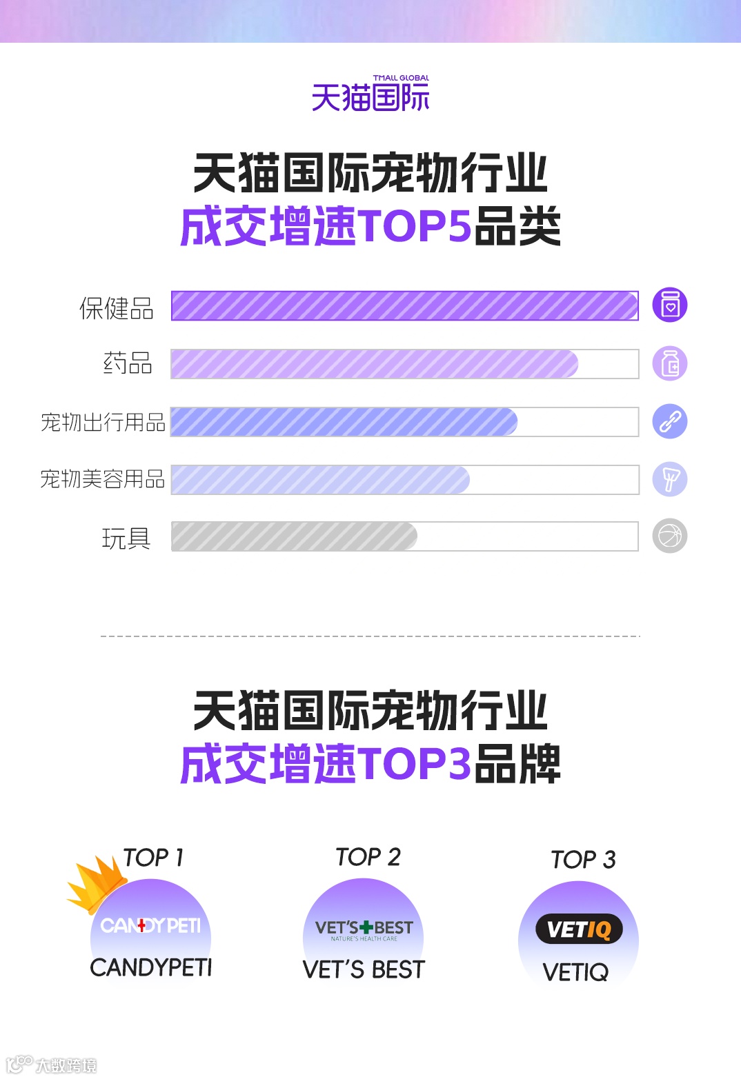 2024年开年以来,天猫国际宠物消费增速最快的五个品类分别是:宠物保健品、宠物药品、宠物出行用品、宠物美容护理用品和宠物玩具。