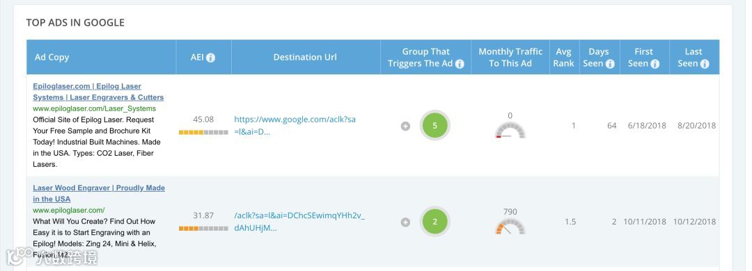 我们还可以访问他们的自然搜索排名以及广告的变体形式, 他们获得的点击次数或每个关键词的支付金额等信息都非常有价值。