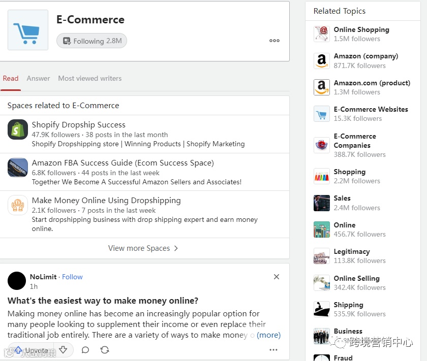 这个网站到底有多值得我们去深耕。先看网站流量:关于电子商务达到2.8M的讨论,还有很多相关话题。
