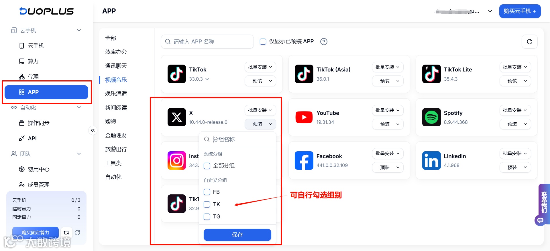 DuoPlus优化了预装APP功能,现在支持在预装时选择对应的云手机分组,仅为选择分组内的云手机完成预装APP,灵活性更强,可以在一定程度上保证云手机的运行效率。