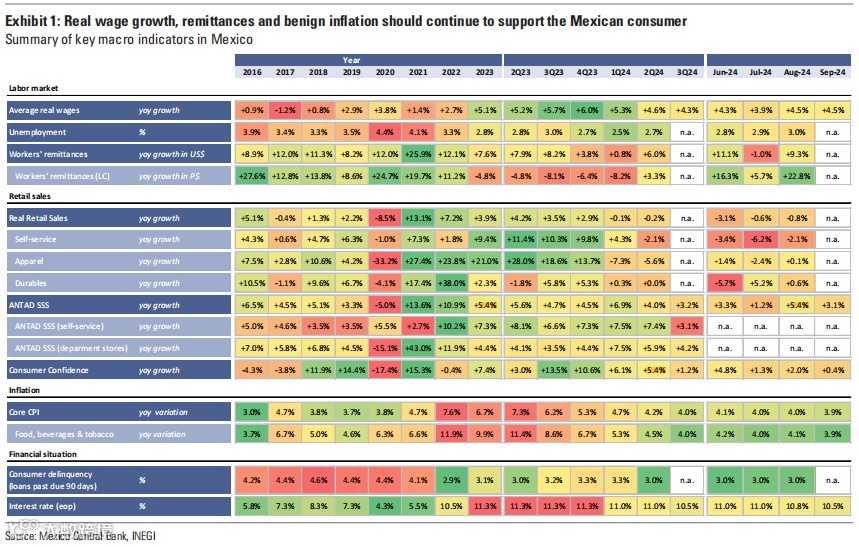 从宏观经济层面来看,墨西哥的就业市场、汇款和信贷表现强劲,为消费市场提供了坚实的基础。9月平均实际工资同比增长4.5%,第三季度平均增长4.3%,这在一定程度上提升了消费者的购买力。同时,7-8月以本币计算的汇款同比平均增长14%,8月更是增长了23%,为部分消费者提供了额外的收入来源,进一步支撑了消费市场的稳定发展。