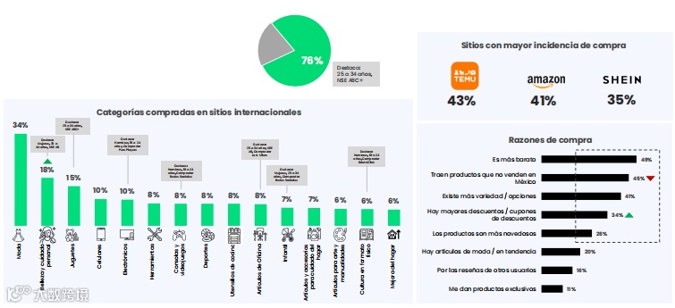 然而,这种线下市场的困境并未阻碍墨西哥消费者在线上寻找心仪商品的热情。根据AMVO发布的《2024年在线研究报告》显示,在墨西哥,76%的线上购物者在过去12个月内曾在国际网站上进行购物。其中,大约十分之八的买家之所以选择从国际网站购买产品,是因为这些网站提供了在墨西哥难以找到的商品、更低的价格以及丰富的产品选择。他们主要购买的商品包括时尚配饰、美容护理产品以及玩具等。
