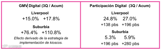 尤为值得一提的是,2024年第三季度,Liverpool的数字平台GMV(商品交易总额)激增17.8%,其中Suburbia品牌更是实现了惊人的110.8%增长,这主要得益于自助终端策略的成功实施。数字渠道销售占比显著提升,Liverpool占比达27.0%,较去年同期增加196个基点;Suburbia占比5.9%,增长280个基点,标志着公司数字化转型成效显著。