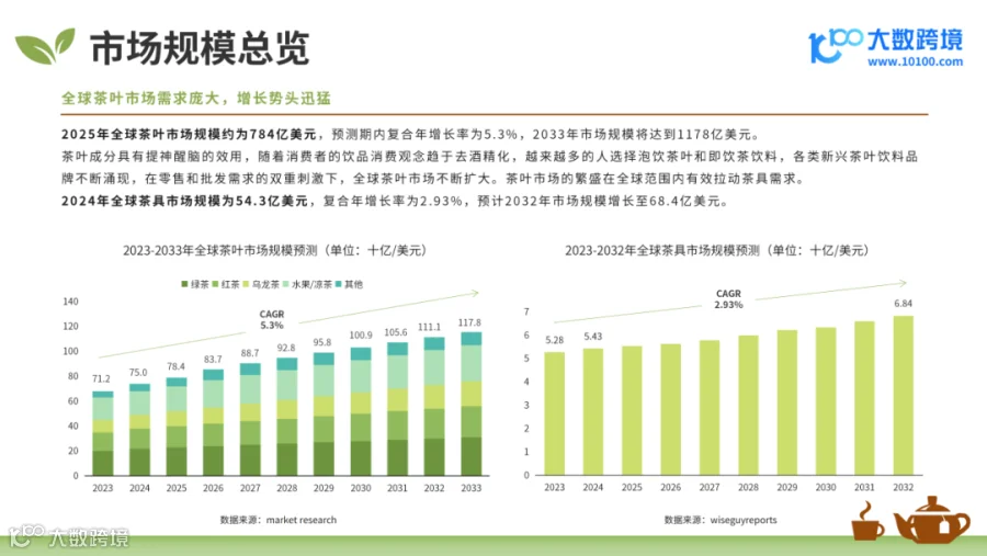 2024年全球茶叶与茶具市场规模分别为750亿美元与54.3亿美元。受全球化与国际贸易推动、文化出海与健康生活意识以及数字化转型与创新设计影响,全球茶叶茶具市场持续扩大。