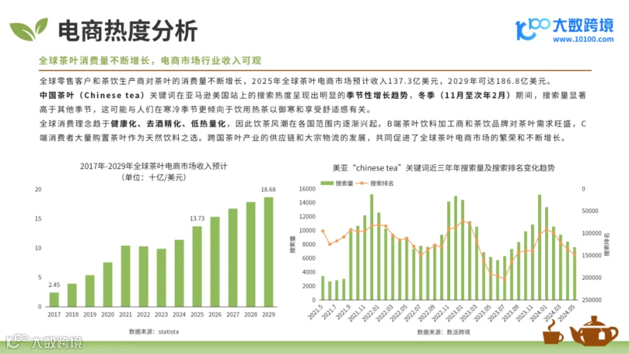 2025年全球茶叶电商市场预计收入137.3亿美元,中国茶叶(Chinese tea)关键词在亚马逊美国站上的搜索热度呈现出明显的季节性增长趋势,冬季(11月至次年2月)期间,搜索量显著高于其他季节。