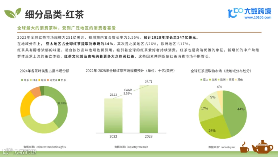 细分市场中,红茶销量第一,亚太占全球红茶提取市场44%;绿茶满足消费者热泡冷饮不同偏好,为第二大市场。