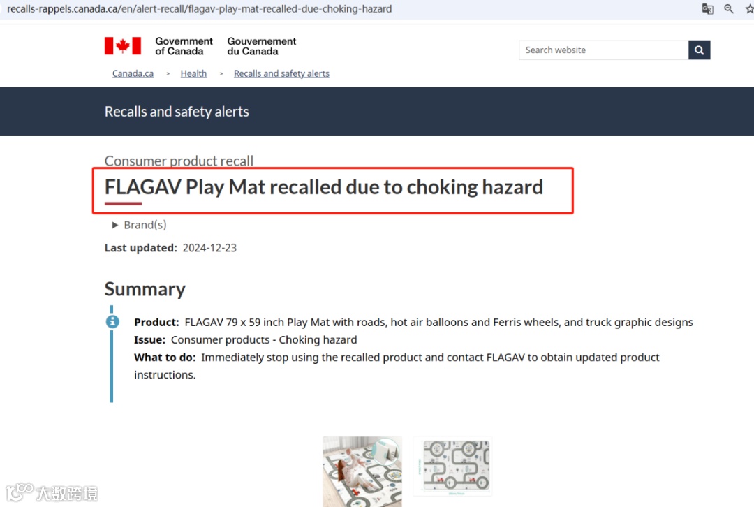图源:canada.ca该产品尺寸为79 x 59英寸,印有城市道路、热气球、摩天路、卡车等图案,批号为CAFH-202402-01、CAFH-202403-02。产品仅在Amazon加拿大站上出售,ASIN为B0BXCS15HT。自上架以来,售出约1295件。据加拿大卫生部公告,该游戏垫频繁使用含有酒精和化学成分的清洁剂会导致涂层在某些区域脱落,有造成幼儿窒息的危险。卫生部提醒消费者立即停止使用该产品,并联系FLAGAV公司进行售后。事实上,市面上存在安全隐患的儿童商品不在少数。今年8月,Temu上所售的一款带衬垫的婴儿床保险杠产品被爆会提高婴儿窒息的风险。当时Temu已删除所有被标记的商品列表,并明确表示后续将加强对产品的监管。图源:cpsc.gov今年9月,Pixel Party旗下一款乳胶气球被曝出存在安全隐患,被英国产品安全和标准办公室(OPSS)紧急召回。据悉,该款产品“含有严重的化学风险,因为其含有的亚硝胺浓度超过了最大允许值”,可能会对使用者的健康造成很大危害。为有效监管产品合规性,各大电商平台及相关部门也在不断加大对产品监管力度,海外市场对销售危险儿童用品也一直保持着“0容忍”的态度。2024年也在不断更新儿童用品安全标准:2月,中国香港政府在宪报刊登《2024年玩具及儿童产品安全条例公告》,以更新《玩具及儿童产品安全条例》下的玩具和相关的六类儿童产品的安全标准;7月,澳大利亚通报了两项强制性标准:《消费品(婴儿产品)信息标准》和《消费品(婴儿睡眠产品)安全标准》;8月,美国消费品安全委员会(CPSC)发布最终的婴儿护理枕安全标准...安全隐患商品的存在是一个复杂的社会问题,还需要多方共同努力,营造更加安全可靠的消费与营商环境,卖家应该时刻保持警醒。