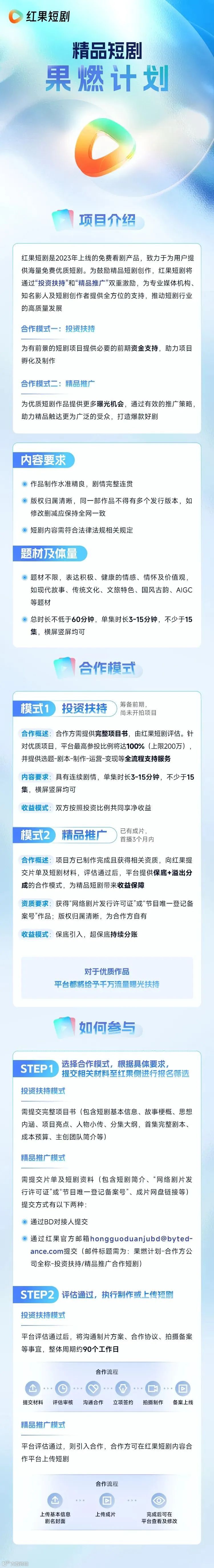 此外,红果短剧还将为两种合作模式中的优质作品提供千万流量曝光支持,以推动其广泛传播。