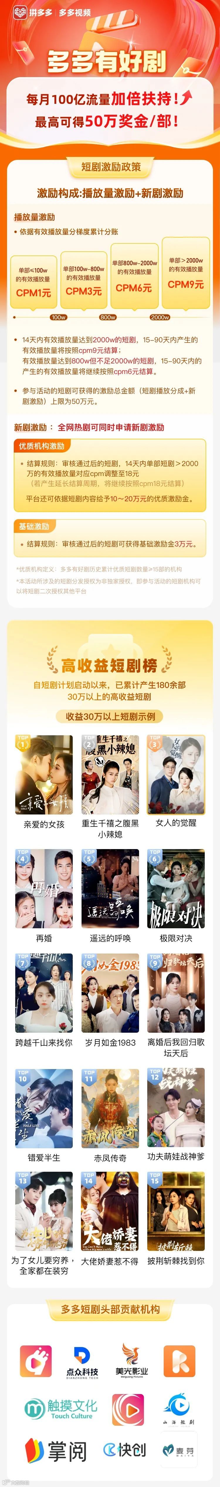 果燃计划图源:抖音集团与此同时,拼多多也发布了“多多有好剧”短剧激励政策,该政策聚焦优质内容创作者,提供每月百亿流量扶持与最高每部50万元的现金激励。