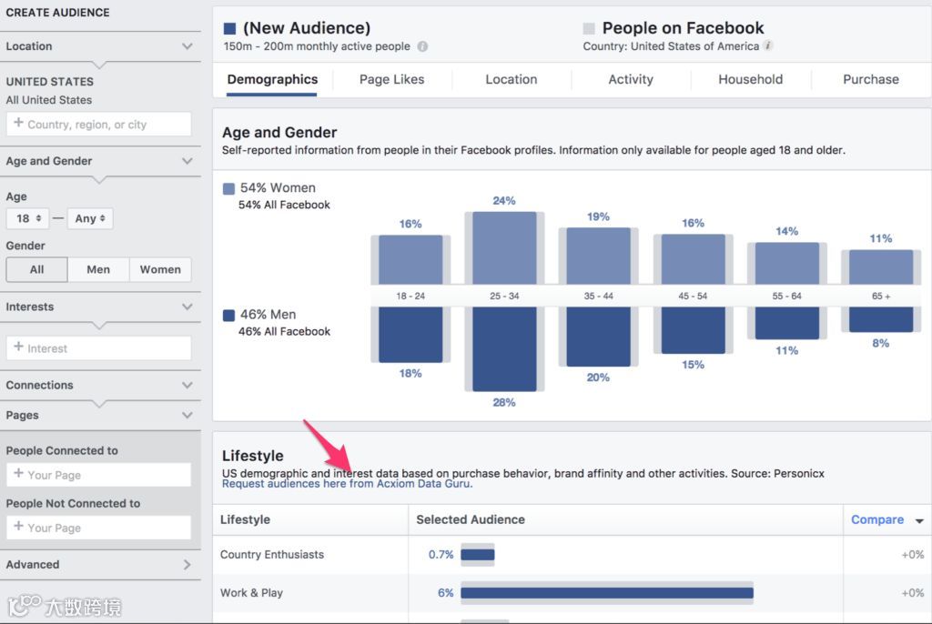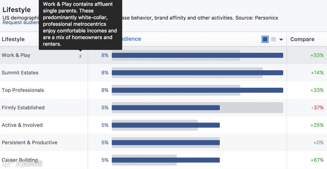 使用原生Facebook数据和第三方来源,Facebook现在可以将人们分成特定的部分,使用人口统计、收入、亲和力、兴趣等,并将其编入生活方式数据标签。