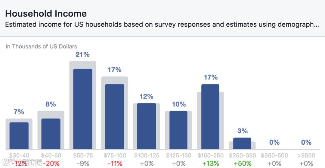 这就需要深入到受众的视野中去寻找一个关键的趋势,我们可以在我们的Lookalike Audiences之上。就像我在我们的研究中提到的寻找客户角色一样,我注意到的第一张图表显示了收入和我们的目标受众的关系。
