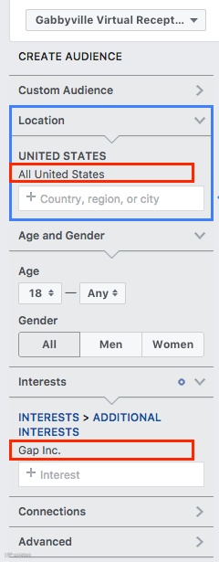 首先,你要选择美国为美国。然后选择兴趣,然后输入“GAP”。你会看到他们的Facebook页面被列出。提示:并不是所有的页面都会出现在这里,通常取决于页面的大小。最简单的方法是在兴趣搜索栏中输入公司页面。